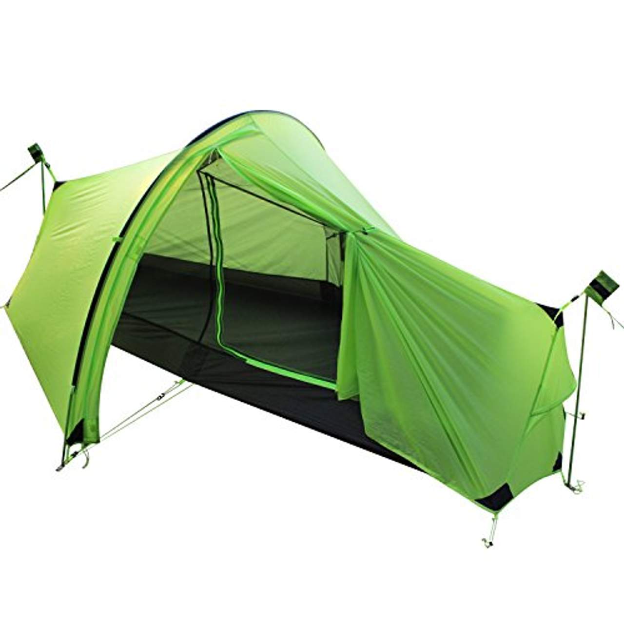 Das Ultra-leicht ca.1200g doppelwandiges Einmannzelt 1 Person ist ein leichtes, doppelwandiges Einmannzelt von Andake. Es wiegt 1,2 kg und kann für die Sternenbeobachtung aufgerollt und oben festgebunden werden. Zur Ausstattung gehören ein Moskitonetz, ein eingenähter Zeltboden, ein Haken für eine Zeltlampe, beidseitig silikonbeschichtetes 15D Ripstop-Nylon mit einer Wasserdichtigkeit von 2000 mm, Belüftungsfenster zur Vermeidung von Kondenswasser, gute Windfestigkeit und 12 superleichte Heringe. Eine Anleitung zum Aufbau des Zeltes ist in einem Video zu sehen.