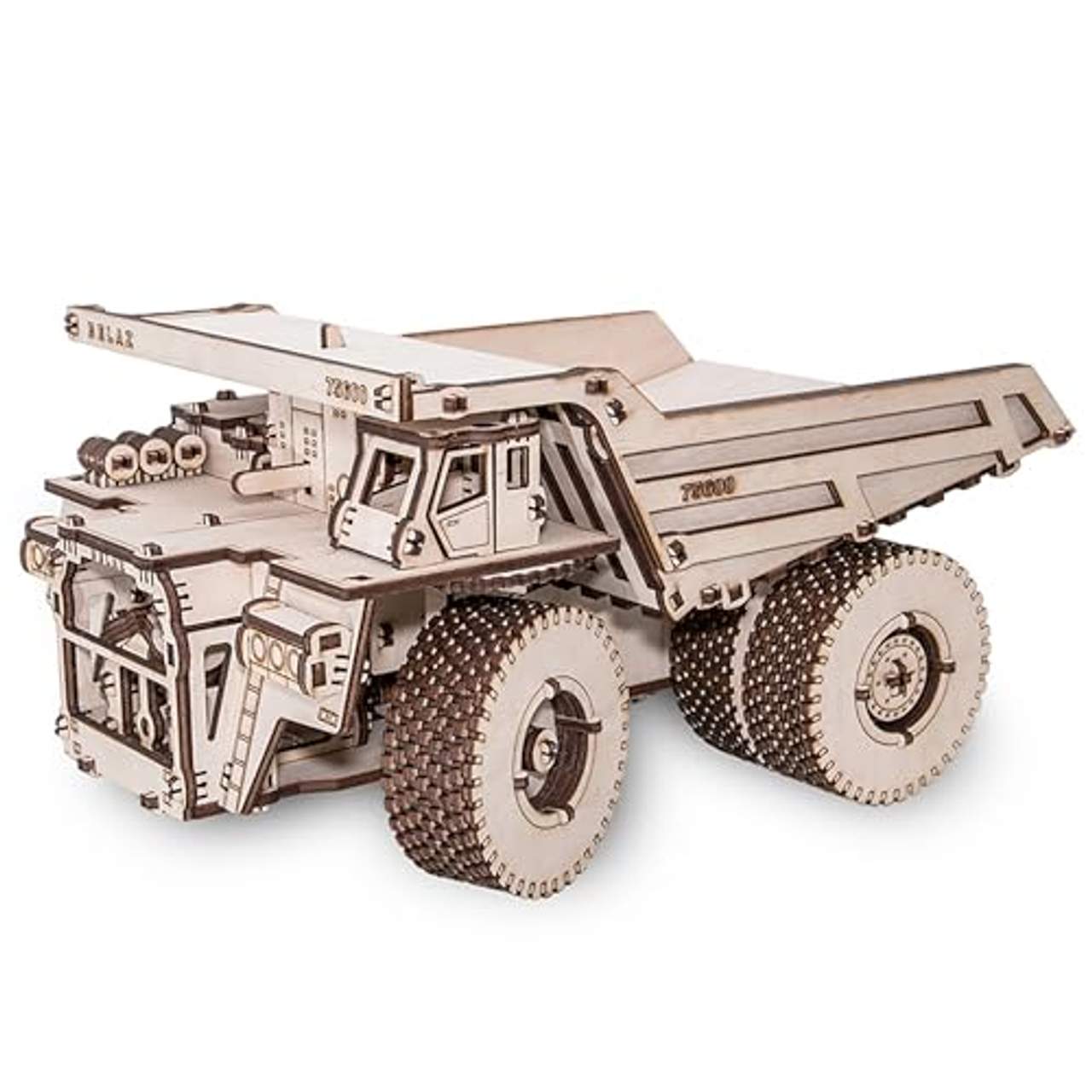 Dieses 3D-Holzpuzzle des Belaz 75600 Kipplasters wird von „EWA Eco-Wood-Art“ hergestellt. Es besteht aus 307 Teilen und ist für Kinder ab 14 Jahren geeignet. Das zusammengebaute Modell misst 31cm x 20cm x 15,5cm und wiegt 1kg. Es braucht weder Werkzeug noch Klebstoff zum Zusammenbau und ist mit einem Aufziehmotor ausgestattet, der es rollen lässt. Die klappbare Kippmulde hat eine Hebelfunktion. Diese einzigartigen Eigenschaften machen dieses Produkt für alle interessant, die sich für Lastwagen und Baufahrzeuge interessieren.