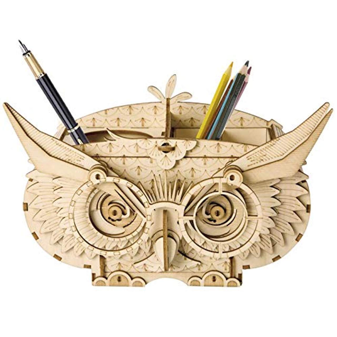 Rolife Woodcraft Kits 3D Holzpuzzle pädagogisches Spielzeug Geschenk ist ein 3D Holzpuzzle mit einem niedlichen Eulenmuster. Es kann als Stifthalter verwendet werden und hilft dabei, die Feinmotorik und die Hand-Augen-Koordination zu verbessern, Geduld zu lernen und vieles mehr. Außerdem fördert es das Problemlösungsvermögen und das schlussfolgernde Denken. Das hochwertige Holzmaterial macht ihn zu einem attraktiven Dekorationsstück für Heim und Büro. Dieses Produkt ist für Kinder ab 8 Jahren geeignet und ist eine gute Wahl für Geburtstagsgeschenke.