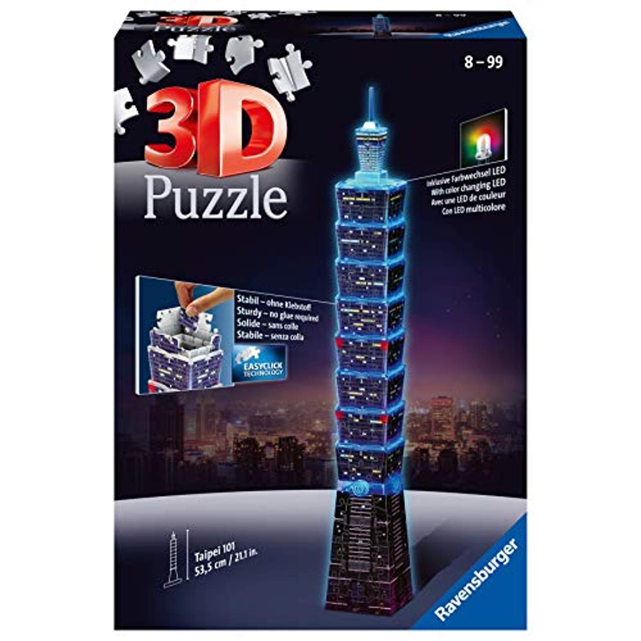 Ravensburger 3D Puzzle 11149 Taipei 101 bei NachtErleben Sie Puzzeln in der 3. Dimension Der eindrucksvolle Taipei 101 als einzigartiges 3D Puzzle mit Beleuchtung! Die Kunststoff-Puzzleteile passen perfekt zusammen und formen ein stabiles 3D Puzzle. Die LED-Leuchten lassen das Bauwerk wahlweise in Weiß oder in Farbe erstrahlen.Das Taipei Financial Center ist ein wahres architektonisches Meisterwerk, was natürlich hauptsächlich an seiner Höhe von 508 Metern und den unglaublichen 101 Stockwerken liegt. Diese geben dem derzeit zehnthöchsten Gebäude der Welt, gemeinsam mit dem Standort, den Namen Taipei 101.Besonders eindrucksvoll zeigt sich das Bauwerk jedoch bei Nacht, dann nämlich erstrahlt es an jedem Abend der Woche in einer jeweils anderen Farbe der sieben Spektralfarben. Für ähnlich atmosphärische Momente sorgt auch die originalgetreue 3D Puzzle Nachbildung.Folgen Sie einfach der Nummerierung der Puzzleteile und lassen Sie Ihren eigenen Taipei Tower Teil für Teil wachsen. Die individuell geformten Kunststoff-Puzzleteile, die dank Easyclick Technology perfekt zusammenpassen, ergeben im Zusammenspiel mit den dekorativen Zusatzteilen ein stabiles Bauwerk, ganz ohne Kleben.Dank der nummerierten Teile und der bebilderten Anleitung ist das Gelingen garantiert. Der Clou ist das im Set inkludierte Leuchtmodul. Die LED-Leuchten lassen das imposante Bauwerk wahlweise in milchigem Weiß oder in kräftigem wechselndem Farblicht erstrahlen.Ein Effekt, der ihn zum Blickfang in jedem Zimmer werden lässt ? vor allem, wenn es dunkel ist. Inhalt 216 nummerierte Kunststoff-Puzzleteile Zubehör Anleitung Leuchtmodul inkl. LEDs