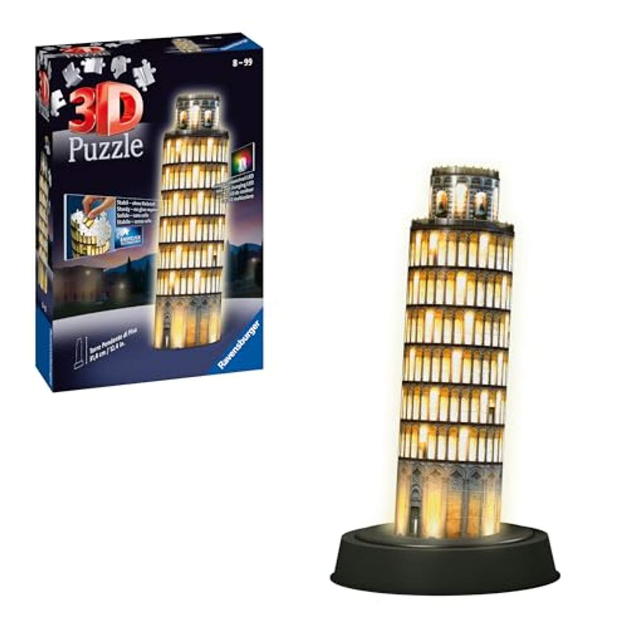 Ravensburger 3D Puzzle Schiefer Turm von Pisa bei NachtDer weltberühmte Turm zum SelbstpuzzelnWofür die mittelalterlichen Bauarbeiter beinahe 200 Jahre gebraucht haben, das schaffen 3D-Puzzler mit ein bisschen Geschick und Fleiß in wenigen Stunden: den Bau des schiefen Turmes von Pisa. Es gibt nur wenige Bauwerke, die weltweit eine solche Bekanntheit erlangt haben wie das Wahrzeichen der italienischen Stadt Pisa.Als 3D Puzzle ist der Nachbau dieses Weltkulturerbes ein tolles Erlebnis – und ganz besonders detailgetreu. Der Clou ist die integrierte LED-Beleuchtung, die in ihrer Farbwiedergabe verstellt werden kann. So entfaltet der schiefe Turm von Pisa seine ganze Magie besonders im Dunkeln. Wer sich daran macht, die 216 nummerierten, individuell geformten Puzzleteile und die Zubehörteile aus stabilem Kunststoff zusammenzusetzen, bekommt eine Ahnung davon, welche Anstrengungen ab 1173 nötig waren, um dieses weltweit einmalige Gebäude zu erschaffen.Und wer hätte damals geahnt, dass der riesige Turm um sage und schreibe 4,5 Meter in Schieflage geraten würde? Genau diese Faszination macht sich breit, wenn eifrige Puzzler den Turm als 3D Puzzle nachbauen. Der Clou ist das im Set inkludierte Leuchtmodul. Die LED-Leuchten lassen das imposante Bauwerk wahlweise in milchigem Weiß oder in kräftigem Farblicht erstrahlen.Ein Effekt, der die herausragende Ausstrahlung dieses Ausnahmebauwerks noch einmal betont und ihn zum Blickfang in jedem Zimmer werden lässt – vor allem, wenn es dunkel ist. So wird die ganze Strahlkraft seiner herausragenden Architektur – und natürlich seiner verblüffenden Schieflage – jeden Tag in den eigenen vier Wänden erlebbar. Ein echtes Weltkulturerbe fürs eigene Zimmer.