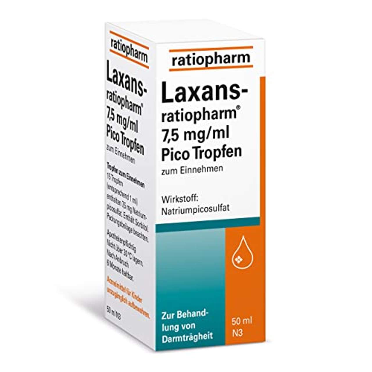 ratiopharm GmbH LAXANS-ratiopharm 7,5 mgVerstopfung? Ratiopharm! Wichtigste Merkmale lassen sich individuell und sparsam dosieren wirksames Abführmittel schonend zum Magen nach Bedarf tropfgenau zu dosieren planbarer Wirkungseintritt Das Mittel gegen Verstopfung: Laxans-ratiopharm Pico Tropfen Wenn die Verdauung im wahrsten Sinne des Wortes ins Stocken gerät, sind allgemeines Unwohlsein und mitunter auch Schmerzen die Folge.Häufig ist eine stärke- und zuckerreiche sowie ballaststoffarme Ernährung ursächlich. Die Laxans-ratiopharm Pico Tropfen sind gut verträgliche Abführtropfen, die effektiv auch hartnäckige Verstopfungen lösen, indem sie den Flüssigkeitsgehalt im Dickdarm erhöhen und so die natürliche Darmbewegung wieder anregen.Eine Verstopfung kann unterschiedlichste Gründe haben: Von falscher und ballaststoffarmer Ernährung bis hin zu erhöhtem Stress ist alles denkbar. Allgemeines Unwohlsein, das sich mitunter auch zu mäßigen bis starken Schmerzen entwickeln kann, ist die übliche Folge einer Verstopfung.Bei akuter Verstopfung können Pflaumen, getrocknete Feigen oder Weintrauben auf natürliche Weise helfen, die Darmtätigkeit anzuregen. Bestimmte Medikamente (sogenannte Laxantien) aus der Apotheke können alternativ helfen, die natürliche Darmbewegung anregen und so akute Verstopfungen schnell und effektiv lösen.Abführtropfen sind gut dosierbar und haben einen planbaren Wirkeintritt Das Laxans-ratiopharm Abführmittel basiert auf dem Wirkstoff Natriumpicosulfat und wird in Tropfenform oral verabreicht. Dank der praktischen und handlichen Tropftube, in der sich die Abführtropfen befinden, kann die Dosierung exakt dem individuellen Bedarf angepasst werden, sodass die Wirkung sanft und dem Grad der Verstopfung entsprechend einsetzen kann.Die abführende Wirkung tritt anschließend in der Regel etwa nach zehn bis zwölf Stunden ein. Die Laxans-ratiopharm Pico Tropfen wirken gezielt am Ursprung der Verstopfung und lösen diese sanft und magenschonend. Im Allgemeinen ist das Abführmittel gut verträglich.Laxans-ratiopharm 7,5 mg/ml darf nicht eingenommen werden wenn Sie allergisch gegen Natriumpicosulfat, verwandte Wirkstoffe aus der Gruppe der Triarylmethane oder einen der sonstigen Bestandteile dieses Arzneimittels sind bei Darmverengung mit verschlechterter Darmpassage, bei Darmverschluss, bei akuten Bauchbeschwerden wie Blinddarmentzündung, bei starken Bauchschmerzen verbunden mit Übelkeit und Erbrechen bei akut entzündlichen Erkrankungen des Magen-Darm-Traktes bei erheblichem Flüssigkeitsmangel des Körpers von Kindern unter 4 Jahren Allergiehinweise: Laxans-ratiopharm 7,5 mg/ml darf nicht eingenommen werden, wenn Sie allergisch gegen Natriumpicosulfat, verwandte Wirkstoffe aus der Gruppe der Triarylmethane oder einen der sonstigen Bestandteile Natriumbenzoat, Sorbitol-Lösung 70 % (nicht kristallisierend) (Ph.Eur.), Natriumcitrat (Ph.Eur.), Citronensäure-Monohydrat, Gereinigtes Wasser sind. Anwendung: Laxans-ratiopharm 7,5 mg/ml ist ein Abführmittel und wird bei Verstopfung sowie bei Erkrankungen, die eineerleichterte Stuhlentleerung erfordern angewendet. Zusammensetzung: Der Wirkstoff ist Natriumpicosulfat.15 Tropfen (entsprechend 1 ml) enthalten 7,5 mg Natriumpicosulfat (als Natriumpicosulfat 1 H2O). Die sonstigen Bestandteile sind: Natriumbenzoat, Sorbitol-Lösung 70 % (nicht kristallisierend) (Ph.Eur.), Natriumcitrat (Ph.Eur.), Citronensäure-Monohydrat, Gereinigtes Wasser. Haltbarkeit nach Anbruch: Sie dürfen dieses Arzneimittel nach dem auf dem Umkarton und dem Etikett/Tubenfalz nach 'Verwendbar bis“ angegebenen Verfalldatum nicht mehr verwenden. Das Verfalldatum bezieht sich auf den letzten Tag des angegebenen Monats.