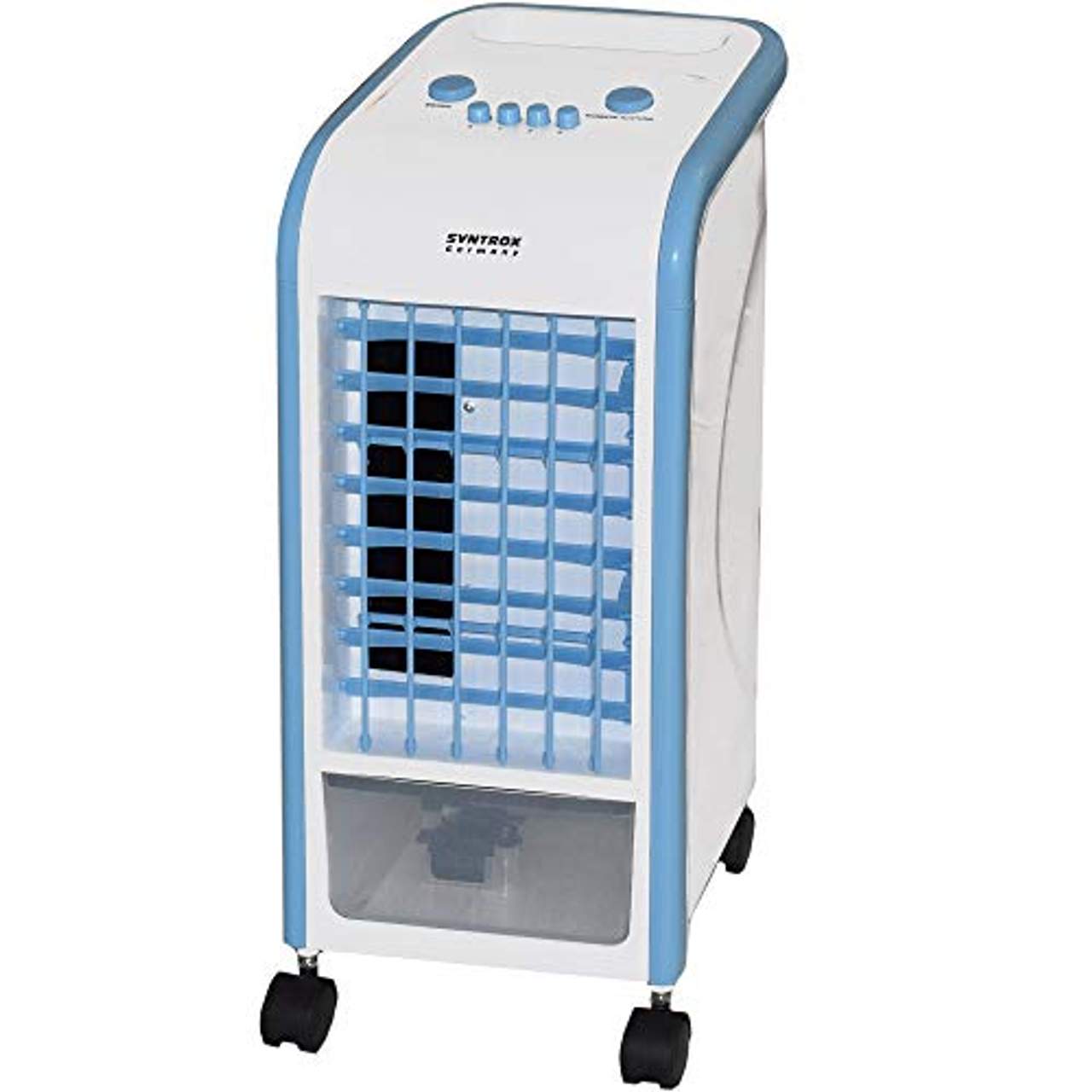 Zusammenfassend lässt sich sagen, dass das Syntrox Germany 4 in 1 Klimagerät Blau ein außergewöhnliches Luftkühlsystem ist, das eine Reihe von Funktionen bietet, die darauf abzielen, die Luftqualität in Innenräumen zu verbessern, indem es effiziente Kühlung, Luftfilterung und Erfrischung bietet. Sein energieeffizientes Design, seine wassersparenden Funktionen und seine Mobilität machen es zu einer idealen Lösung für Wohn- und Geschäftsräume.