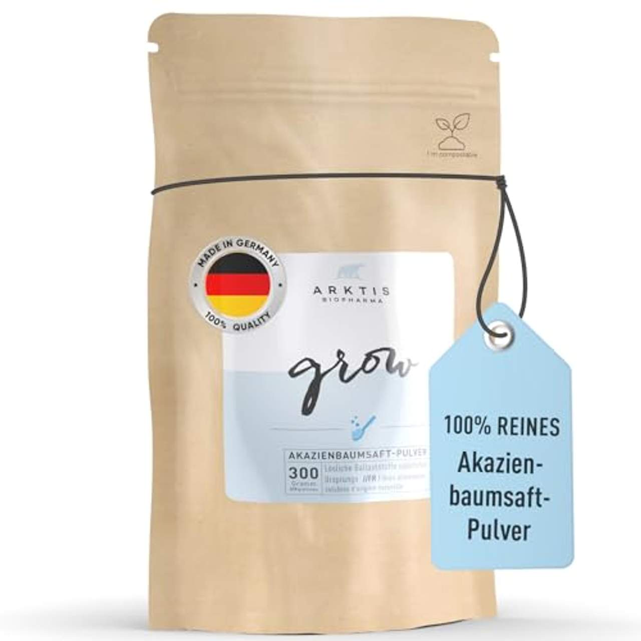 Arktis BioPharma AkazienfasernNahrungsergänzungsmittel sind kein Ersatz für eine ausgewogene, abwechslungsreiche Ernährung und eine gesunde Lebensweise. Darmbakterien sind in der Lage, deine Nahrung aufzuspalten und so zur Versorgung deines Organismus beizutragen. Aber nicht nur du, sondern auch die Kleinstlebewesen in deinem Bauch haben Hunger.Mit Grow führst du deinem Körper 80 % lösliche Ballaststoffe zu. Diese Ballaststoffe dienen vornehmlich bestimmten Bakterien als 'Futter“ und stimulieren auf diese Weise die Teilung der spezifischen Bakterien Akkermansia muciniphila und Faecalibacterium prausnitzii. Durch das vermehrte Wachstum der Bakterien wird wiederum auch die Aufspaltung unserer Nahrung zu kurzkettigen Fettsäuren verbessert – eine WIN-WIN-Situation. Aber wie werden “Akazienfasern” gewonnen? In der afrikanischen Sahelwüste wachsen die Akazienbäume, die den Rohstoff für Arktis Grow liefern. Durch einen Einschnitt der Baumrinde wird der benötigte 'Baumsaft“ gewonnen und gesammelt. Schonend gereinigt, getrocknet und gemahlen dient es uns als löslicher Ballaststoff zur Regulation der Verdauung. Arktis Grow enthält 100% reine Akazienfasern, oder richtig: Akazienbaumsaft-Pulver, (ohne synthetische Zusätze), ist neutral im Geschmack, Geruch sowie in der Farbe.Es wird sehr gut vertragen und es treten keine lästigen Blähungen auf – eine gute Nachricht für alle, die ohnehin mit Verdauungsbeschwerden zu kämpfen haben. Im Bereich der Lebensmittelwerbung gilt aufgrund der 'Health-Claims“-Verordnung (EG 1924/2006) mittlerweile ein absolutes Werbeverbot. Konsequenz dieser europarechtlichen Regelungen ist unter anderem, dass ernährungsmedizinische Wirkungen – selbst wenn sie durch aussagekräftige Studien belegt sind – erst dann ausgelobt werden dürfen, wenn sie in einem (langwierigen und kostenaufwändigen) Verfahren von den zuständigen europäischen Institutionen zugelassen wurden. Unter anderem aus diesem Grund finden Sie zu unseren Produkten nur die gesetzlich vorgeschriebenen Pflichtangaben.Zutaten: Gummi arabicum (Acacia Senegal) Verzehrempfehlung: Zweimal täglich 1 gestrichenen Dosierlöffel in ein Glas Wasser einrühren und trinken. Hinweis: Die angegebene empfohlene tägliche Verzehrmenge darf nicht überschritten werden. Lagerung: Außerhalb der Reichweite von kleinen Kindern lagern. Nettofüllmenge: 300 g Pulver Hersteller: Arktis BioPharma GmbH & Co.KG D-58739 Wickede (Ruhr)