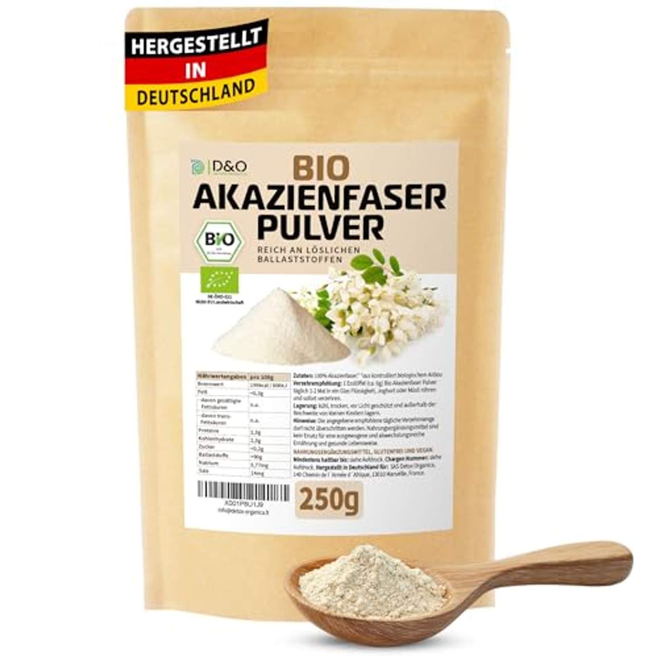 D&O Nature Products Akazienfasern Bio wird in Deutschland hergestellt und unterliegt strengen Qualitätskontrollen, um sicherzustellen, dass du ein hochwertiges Produkt erhältst, das deinen diätetischen und ethischen Präferenzen entspricht.