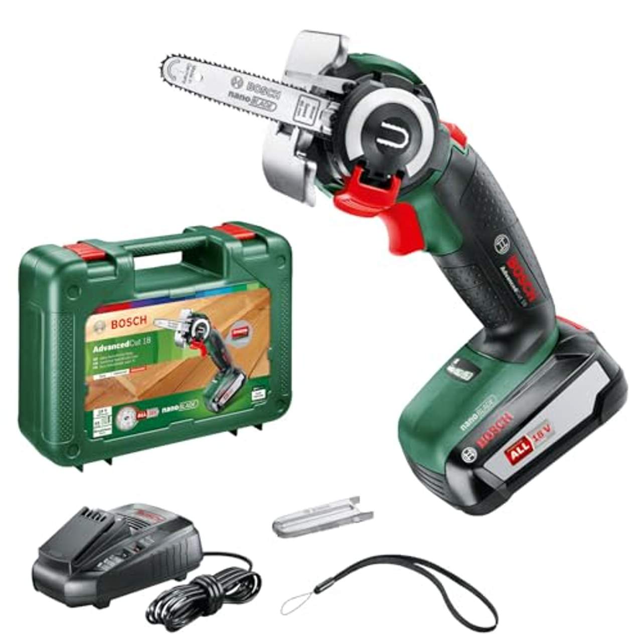 Bosch Akku-NanoBlade-Säge AdvancedCut 18Marke: BOSCH HOME & GARDEN • Farbe: rot, grün, schwarz • Serienname: Advanced Cut 18 • Geeignet für: Holz, Äste, Zweige • Anwendungsbereich: Werkstatt, Garten, Hobby • Einsatzbereich: außen • Akkukapazität: 2,5 Ah • Akkuspannung: 18 V • Akkutyp: Lithium-Ionen • Antriebsart: Akku • Anzahl Akkus: 1 • Leerlaufhubzahl: 7000 Hübe/min • Materialeignung: Holz • Art des Sägeblatts: Nanoblade wood speed 65 • Höhe: 28 cm • Länge: 10 cm • Breite: 21 cm • Gewicht mit Akku: 1,1 kg • Gewicht ohne Akku: 0,7 kg • Sägeblatt Länge: 65 mm • Schnitttiefe in Holz (max.): 65 mm • Schnitttiefe (max.): 65 mm • Einschaltsperre: Ja • Ladestandanzeige: Ja • Ausstattung: Einschaltsperre, Ladezustandsanzeige, Spaltkeil, isolierte Grifffläche • Akku enthalten: Ja • Lieferumfang: Säge, 1 Akkupack PBA 18 V 2,5 Ah W-B , Kunststoffkoffer Ladegerät AL 1830 CV, Befestigungsschlaufe, nanoBLADE Wood Speed 65, Schutzkappe