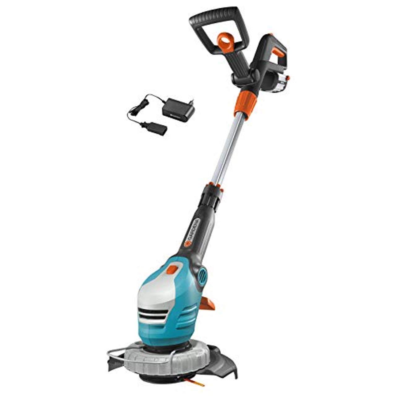 Gardena Akku-Trimmer ComfortCut Li-18/23R: RasentrimmerGARDENA 9825 Trimmer ComfortCut Li-18/23R - Der leichte, besonders komfortabel zu bedienende GARDENA Accu-Trimmer ComfortCut Li-18/23R eignet sich besonders zum Trimmen von langen Rasenkanten und schwer zugänglichen Stellen. Der auswechselbare Lithium-Ionen-Accu ist besonders leistungsstark, so dass er für eine kraftvolle und ausdauernde Schneidleistung sorgt. Das dabei eingesetzte Rotor-Cut-System sorgt für exakte Schneidergebnisse und ist besonders geräuscharm.Der extra lange und ganz einfach verstellbare Zusatzgriff sorgt für eine bequeme und ergonomisch optimale Arbeitshaltung. Für mehr Komfort bei der Arbeit kann der Teleskopstiel an die jeweilige Körpergröße angepasst werden. Überhängende Kanten können dank des 90°-Kantenschnitts einfach getrimmt werden.Für bequemes Arbeiten sorgt dabei das integrierte Führungsrad. Die Stielneigungsverstellung am Trimmerkopf erleichtert das Arbeiten an schwer zugänglichen Stellen, z.B. unter einem Trampolin oder einer Gartenbank. Wird nahe an Beeten und Blumenrabatten getrimmt, kann zum Schutz der Blumen der Pflanzenschutzbügel ausgeklappt werden.Dank des Sicherheitsschalters ist der Accu-Trimmer vor unbeabsichtigtem Einschalten geschützt. Der Trimmer ist komplett mit einem Accu-Pack, Ladegerät, Magazin für Ersatzmesser und 20 Ersatzmessern ausgestattet. Zur erstmaligen Montage wird kein Werkzeug benötigt. Der Schnittkreis beträgt 230 mm.Mit einer Leistung von 18 V / 2,0 Ah des Lithium-Ionen-Accus kann eine Laufzeit von bis zu 50 Minuten erreicht werden. Dies ist für ca. 1.250 m Rasenkante ausreichend. Die Ladezustandsanzeige am Akku gibt an, wenn nachgeladen werden muss. Innerhalb von ca. 3 Stunden ist ein leerer Accu wieder komplett aufgeladen.