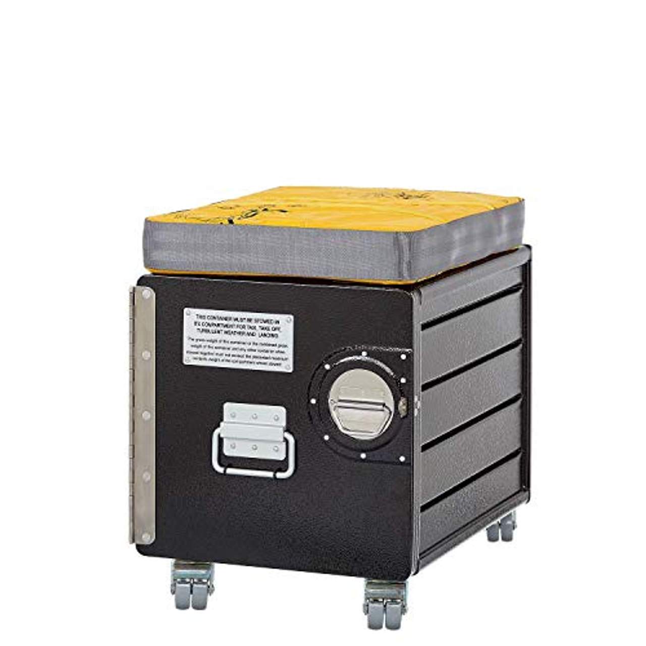 Die Polsterung der VanDeBord Bord Box M Hocker Schwarz besteht aus echten Flugzeug-Rettungswesten, was dem Design ein einzigartiges und authentisches Element verleiht. Außerdem verfügt sie über einen Flugzeugsicherheitsgurt, der sowohl ihre Ästhetik als auch ihre Funktionalität erhöht.
