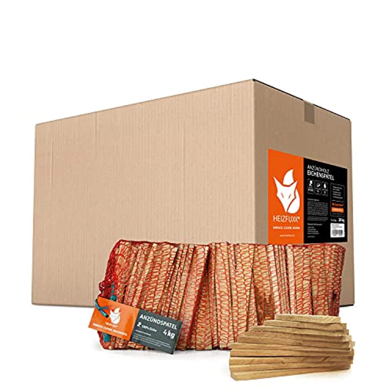 28kg Anzündholz Anzündspatel Anfeuerholz Anmachholz BrennholzAnzündholz im Paket Das Anzündholz der Marke Heizfuxx > ist ein besonders trockenes Spaltholz mit einer Länge von etwa 16 Zentimeter. Mit den kleinen Spateln verläuft das Anzünden anderer Brennstoffe > noch schneller. Die Eichenspatel weisen eine sehr geringe Restfeuchte von unter 10 Prozent auf und verfügen deshalb über bestmögliche Brenneigenschaften. Das feine Anmachholz ist ofenfertig und in praktischen Netzen mit je 4 Kilogramm verpackt. Sie können das Anfeuerholz einzeln im Karton mit je 7 Bündeln oder mit 24 Kartons auf Palette kaufen. Der Feueranzünder ist zu 100 Prozent aus natürlicher Eiche hergestellt und somit ein absoluter Bio Anzünder. Die Eichenspatel können mit 16 Zentimeter Länge für fast jede Feuerstätte, also für den Grill, für den Kamin, die Feuerschale oder den