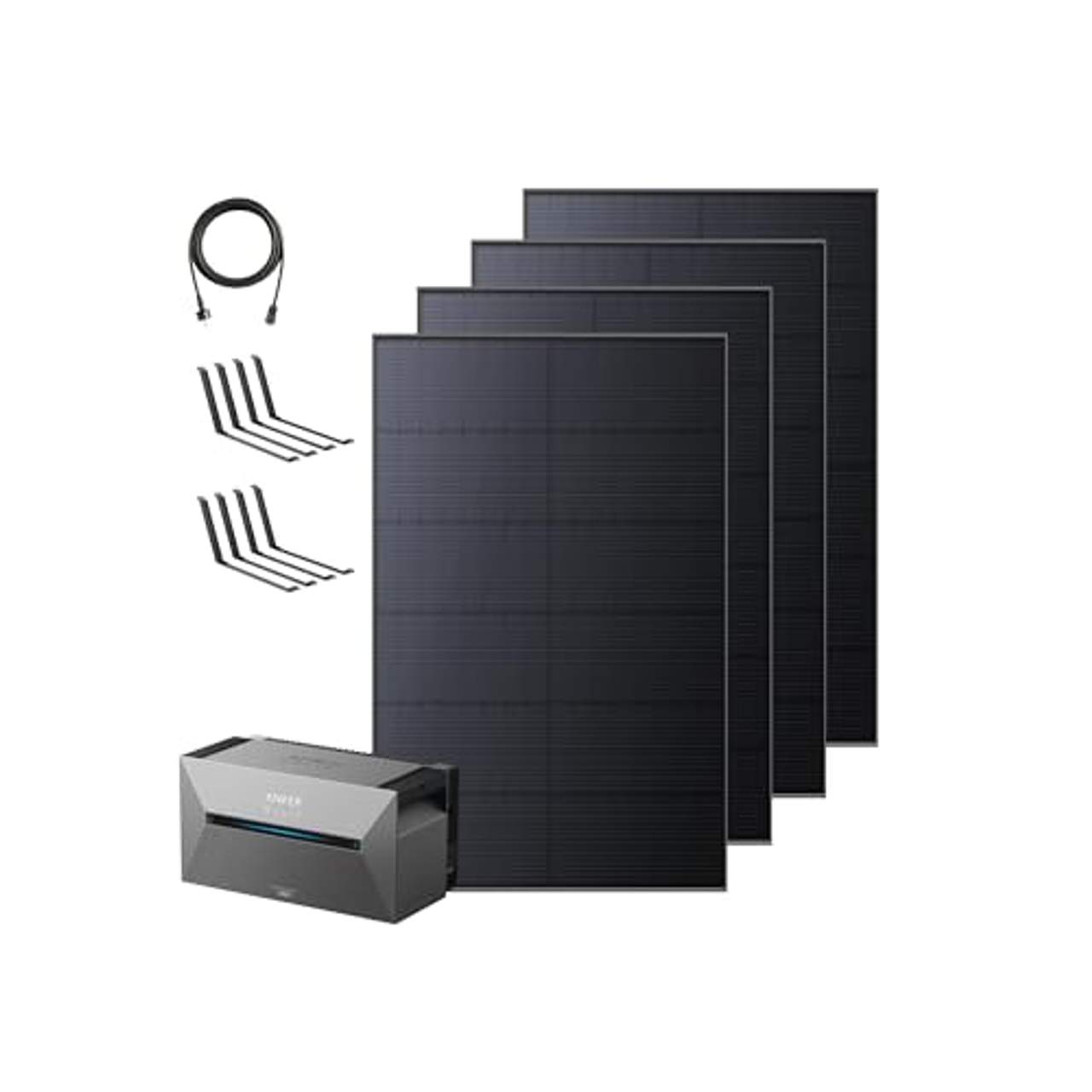 Wenn du das Anker Solix Balkonkraftwerk mit Speicher kaufst, ist alles enthalten, was du für die sofortige Installation brauchst. Das heißt, du erhältst die Solarbank 2 E1600 Pro, vier bifaciale Rs40t Typ-N-Solarmodule sowie Kabel und Halterungen, die eine sichere Montage und einen ordnungsgemäßen Aufbau direkt nach dem Auspacken ermöglichen.