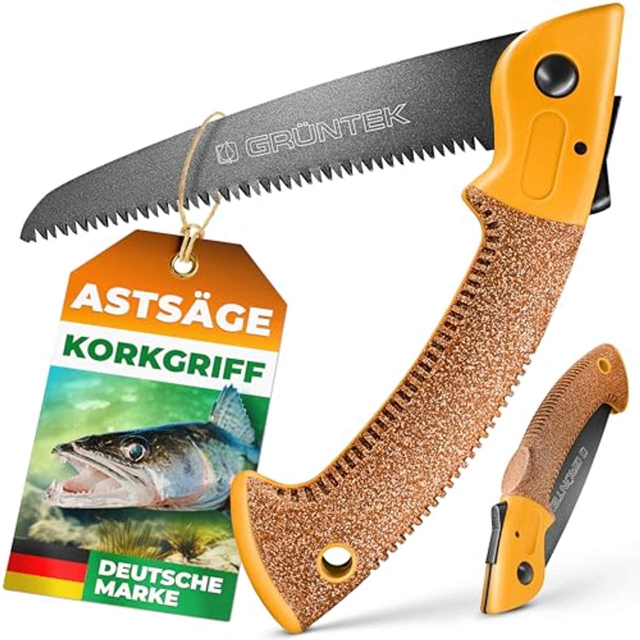 GRÜNTEK Klappsäge Zander gehärtetes Carbonstahl 180mmModerne KlappsägeDie besten Gartenwerkzeuge sollten nicht teuer sein, sie müssen aber modern, hochwertig und bequem sein - und selbstverständlich mit Seele kreiert werden. Wir benutzen unsere Gartengeräte täglich in unserem Garten, daher sind unsere Gartenwerkzeuge genauso, wie man es für sich selbst gewünscht hätte.Angenehmer Kork-Griff mit Soft-Touch-Form liegt sicher und bequem in der HandTeflon-beschichtetes Sägeblatt aus High Carbon Steel mit impulsgehärteter PräzisionszahnungErgonomische Griffform und Kork-Fingergriff verhindern das Abrutschen4 verstellbare Positionen für verschiedenste Säge-AnwendungenEinfache Lagerung bei scharfem SchnittMithilfe der Einklapp-Funktion sowie dem praktischen Aufhängeloch ist die Klappsäge leicht verstaut und sicher gelagert, egal ob in der Hosentasche oder im Gartenhaus.High Carbon Steel mit perfekter Härte für das Sägen sowie Teflon-BeschichtungGebogenes Sägeblatt mit impulsgehärteter Präzisionszahnung6 Zähne pro Zoll mit dreikantigem Schliff der ZähneGesamtlänge von 410 mm und Länge des Sägeblatts von 180 mmVorteile:4-fach verstellbarMithilfe der Umstellungfunktion an der Rückseite des Klappsäge können Sie sicher und bequem in drei verschiedenen Positionen sägen. In der eingeklappten Position können Sie die Säge sicher in der Hosentaschen verstauen - kein lästiges Herumtragen mehr! Scharf und RobustDas Teflon-beschichtetes Sägeblatt aus hochwertigem High Carbon Steel ist mit seiner impulsgehärteten Präzisionszahnung perfekt für einen effektiven Einsatz im Garten ausgelegt. Die Zähne sind speziell dreikantig geschliffen und schneiden hierdurch effektiver.Handlicher KorkgriffDer ergonomisch geformte Kork-Soft-Touch-Griff liegt sicher und bequem in der Hand. Dabei verhindert der Griffteil das Abrutschen und ermöglicht so einen verlässlichen Einsatz. Ein kleines Aufhängeloch erleichert die Lagerung. Vielfältig einsetzbarDie Klappsäge sägt verschiedenstes Holz verlässlich -Indoor und Outdoor.Auch für dickere Äste bis Ø 35 mm. Verstopfungsfreies Sägen wir durch die spezielle Anordnung der Zähne garantiert.