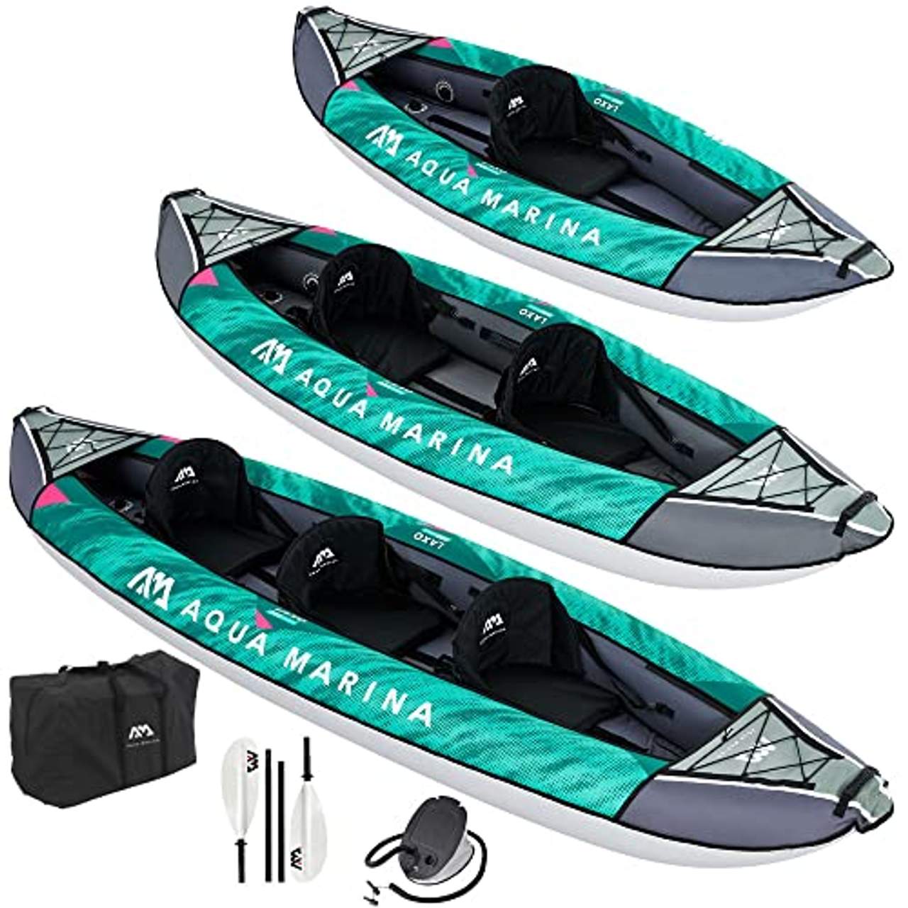 AM AQUA MARINA Kajak aufblasbar im SetAqua Marina Laxo Kajak Set 2-3 Personen Tragkraft 210kg aufblasbar 380cm - 12’6’’ Das Aqua Marina Laxo Freizeit -Kajak ist vielseitig einsetzbar und bietet viel Platz. Gefertigt ist aus extrem haltbaren PVC Material. Die LAXO-Serie wird für 2022 mit revolutionärem Schutzhüllengewebe (AQUASHELL-Technologie) aufgerüstet. Dies garantiert eine hohe Haltbarkeit, Festigkeit und Formstabilität.Durch den flachen Boden und dem Hochleistungs-Finnensystem mit 2 Finnen hat es hervorragende Fahreigenschaften und eine gute Manövrierbarkeit, ideal für den Einsatz auf Flüssen und Seen. Dank der leichten Handhabung ist es sowohl für Anfänger als auch für Fortgeschrittene sehr gut geeignet. Mit einer Länge von 380 cm und einer Tragkraft von über 200kg ist das Laxo für bis zu 2 - 3 Personen geeignet. Perfekt für eine Familie z.B. mit zwei Erwachsen mit einem Kind. Alternativ bietet das Laxo einem Solo-Paddler viel Platz für Ausrüstung und Gepäck. Für Sitzkomfort bei Kajak-Touren sorgen die einzeln herausnehmbaren Kajak Sitze.Bequem mit hoher Rückenlehne, verstellbarer Sitzposition, weichen Polsterung und mit Aufbewahrungstaschen an der Rückseite. Produktdetails auf einen Blick: -Laxo Kajak Set für 2-3 Personen / Modell 2022 -Tragegriffe für den Transport -Boston-Ventile zum einfachen Aufpumpen -Finnensystem mit 2 Finnen -Spritzschutz, Gepäck-Schnürung am Bug und Heck -Maße: LB: 380cm x Breite: 90cm, Gewicht: 17,5kg -max. Tragkraft 210kg -Luftkammern: 21 -Ablassventil: 1 Lieferumfang: Kajak, 3 x Premium Kajaksitze, 2 x KP-1 Kajak Paddel, Fußpumpe, Tragetasche Weitere Hinweise Aqua Marina Laxo Kajak Modell 2022 - Komplett Set mit aufblasbarem Mehrpersonen Boot, 3 x Komfort-Sitzen, 2 x Paddle und Fuß-Pumpe in einer praktischen Tragetasche Vereint Komfort, gute Manövrierbarkeit und hohe Formstabilität, flacher Boden, AQUASHELL-Technologie, 21 Luftkammern Tragkraft von über 200 kg, Platz für 2-3 Personen, als Familien-Kajak für 2 Erwachsene und Kind oder Solo-Paddler mit Gepäck, Sitze herausnehmbar als Dreisitzer, Zweisitzer oder Einsitzer nutzbar Hochleistung-Finnen-System mit 2 Finnen für hervorragende Fahreigenschaften, ideal für den Einsatz auf Flüssen und Seen, als Freizeit und Tourenkajak für längere Kanu-Touren Spritzschutz und Cargo-Bungee-System zum einfachen Befestigen des Gepäcks, Luftboot Länge: 380 cm, Breite: 90 cm, Gewicht:17,5 kg, max. Tragkraft 210 kg