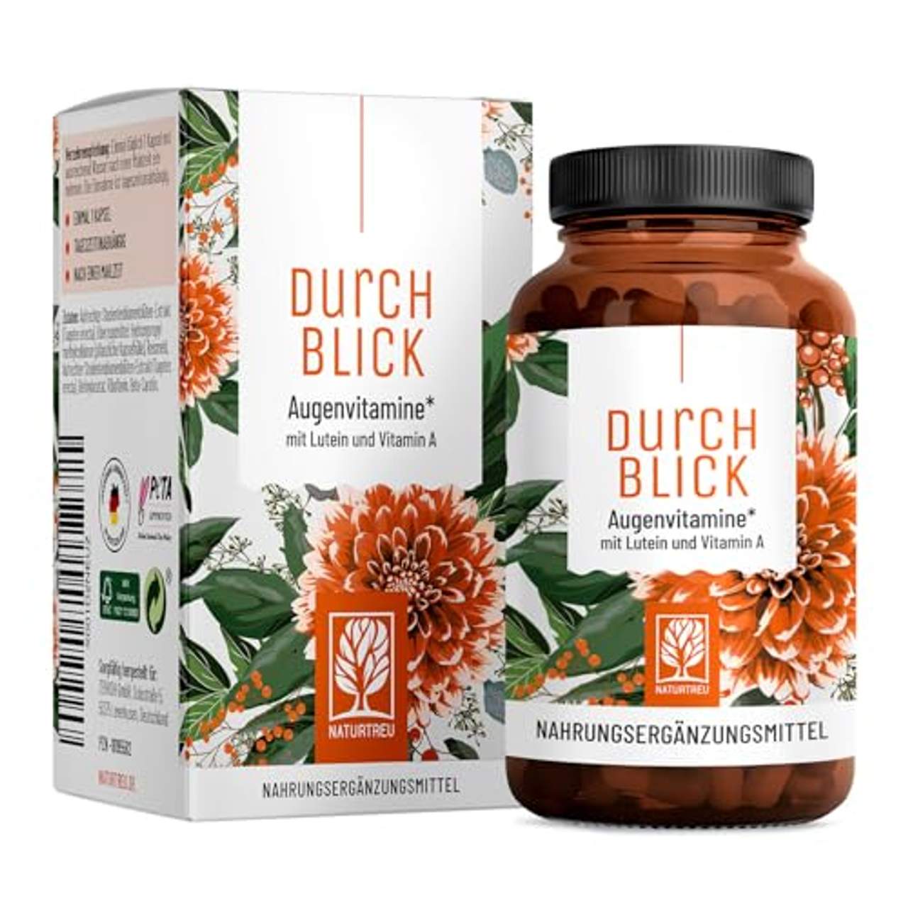 NATURTREU Augenvitamine Lutein Zeaxanthin Komplex KapselnDurchblick - Informationen auf einen Blick: Pro Tagesdosis (1 Kapsel): 120 mg Studentenblumenblüten-Extrakt - davon 20 mg Lutein davon 2,5 mg Zeaxanthin Abgerundet - mit 1,4 mg Vitamin B2, 895 µg Vitamin A, 12,5 µg Beta-Carotin Vegan - natürlich ist das Produkt vollkommen vegan und frei von Tierversuchen Reinheit - ohne Gentechnik, ohne Magnesiumstearat und ohne Zusatz-, Füllstoffe oder sonstige Aromen Ein sicheres Gefühl - Unabhängige Laborprüfungen auf Belastung und Wirkstoffgehalt werden regelmäßig durchgeführt Warum Durchblick: Durchblick Augenvitamine sind eine durchdachte Komposition aus innovativen und bewährten Inhaltsstoffen für Ihre Augengesundheit*. In nur einer Kapsel finden Sie 20 mg Lutein und 2,5 mg Zeaxanthin abgerundet mit Klassikern wie Vitamin A, B2 und Beta-Carotin. Vitamin A trägt zur Erhaltung normaler Sehkraft bei. Vitamin A trägt zur Erhaltung normaler Schleimhäute bei. Vitamin B2 trägt zur Erhaltung normaler Schleimhäute bei. Vitamin B2 trägt dazu bei, die Zellen vor oxidativem Stress zu schützen.