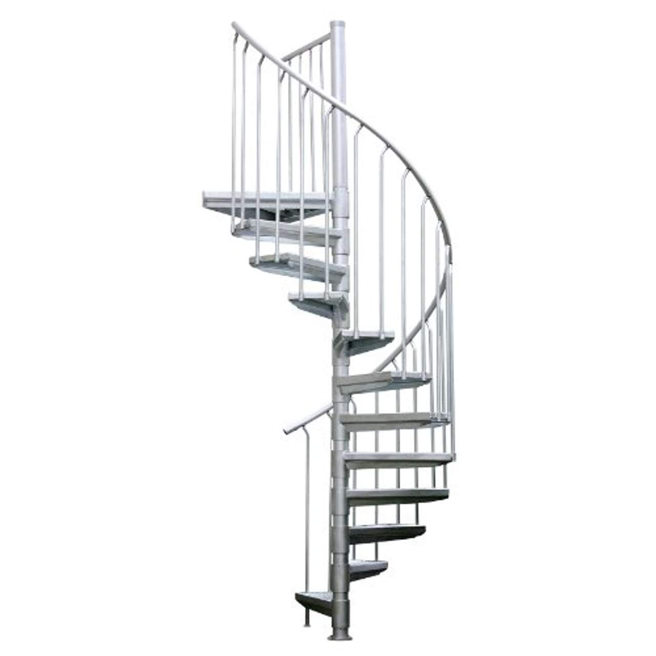 - Umfassendes Set: Das Set enthält 12 Stufen (11 Stufen und 1 normales Podest mit Streckmetallgitter), 3-teiliges Standrohr, Metallteile feuerverzinkt, Metallgeländer mit gebogenem Aluminiumhandlauf ø40 eloxiert, Podestgeländer - also ein umfassendes Set für Ihren Bedarf an Spindeltreppen im Freien.