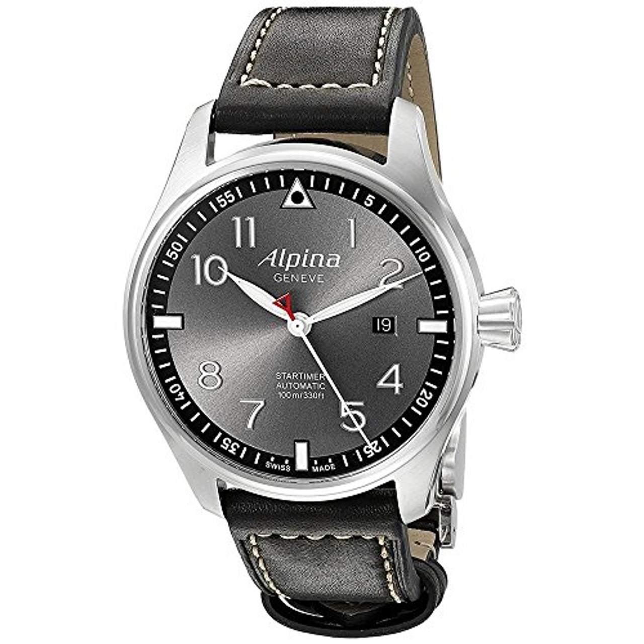 Alpina Herren Analog Automatik Uhr AL-525GB4S6Dieser luxuriöse Automatikchronograph entstand im Traditionshaus Alpina in der Schweiz. Dort versteht man sich seit jeher auf Uhren, die durch technische Präzision und gehobenes, sportliches Design begeistern. Hier trifft ein schwarzes Lederarmband mit Kontrastnähten auf ein Zifferblatt in Grau und ein Gehäuse in Silber.Große Zahlen und Leuchtzeiger erleichtern die Lesbarkeit von Uhrzeit und Datum und bringen eine moderne Note in das traditionelle Äußere der Uhr. Im Inneren sitzt das hochwertige Automatikuhrwerk Sellita SW200B-D3 mit 26 Steinen.