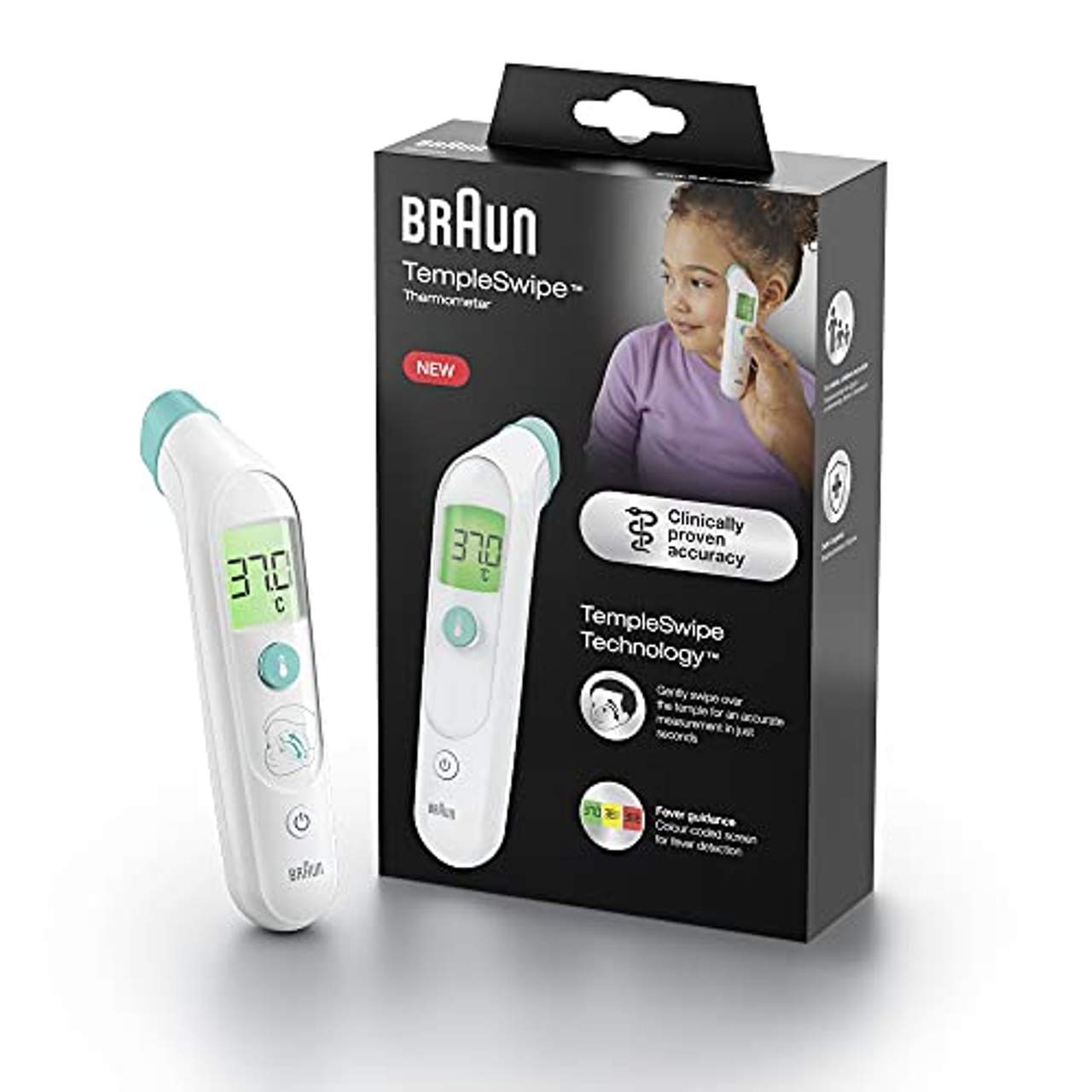 Braun Sensian Swipe 5 SchläfenthermometerBraun TempleSwipe Temporal-Thermometer BST200 ist ein Thermometer für Säuglinge, Kinder und Erwachsene, das eine schnelle, sanfte und einfache Temperaturmessung ermöglicht. Das sichere und hygienische Gerät funktioniert, indem es in Richtung der Schläfenarterie platziert wird, die direkt mit dem Herzen verbunden ist, einen konstanten Blutfluss bietet und nahe genug an der Hautoberfläche platziert ist, um eine genaue Temperaturmessung zu liefern.Dank der TempleSwipe-Technologie erkennt der Sensor eine Vielzahl von Infrarot-Wärmepunkten und erhält so bei jeder Messung eine korrekte und genaue Temperatur. Einfach die Temperatur messen und das Display leuchtet grün, gelb oder rot, um Ihnen bei der Interpretation der Messung zu helfen.Vorteile1 Thermometer,1 Schutzkappe,2 Alkaline-Batterien 1,5V AAA LR03.Garantie 2 Jahre.AnzeigeTemperaturmessung der Schläfenregion.Anwendung Legen Sie das Thermometer an die Haut, direkt über der Augenbraue. Drücken Sie den Temperaturmessknopf. Während Sie den Kontakt mit der Haut aufrechterhalten, gleiten Sie vorsichtig an der Schläfe entlang in Richtung Ohr.Gehen Sie zurück in Richtung Augenbraue, bis Sie einen langen Piepton hören.