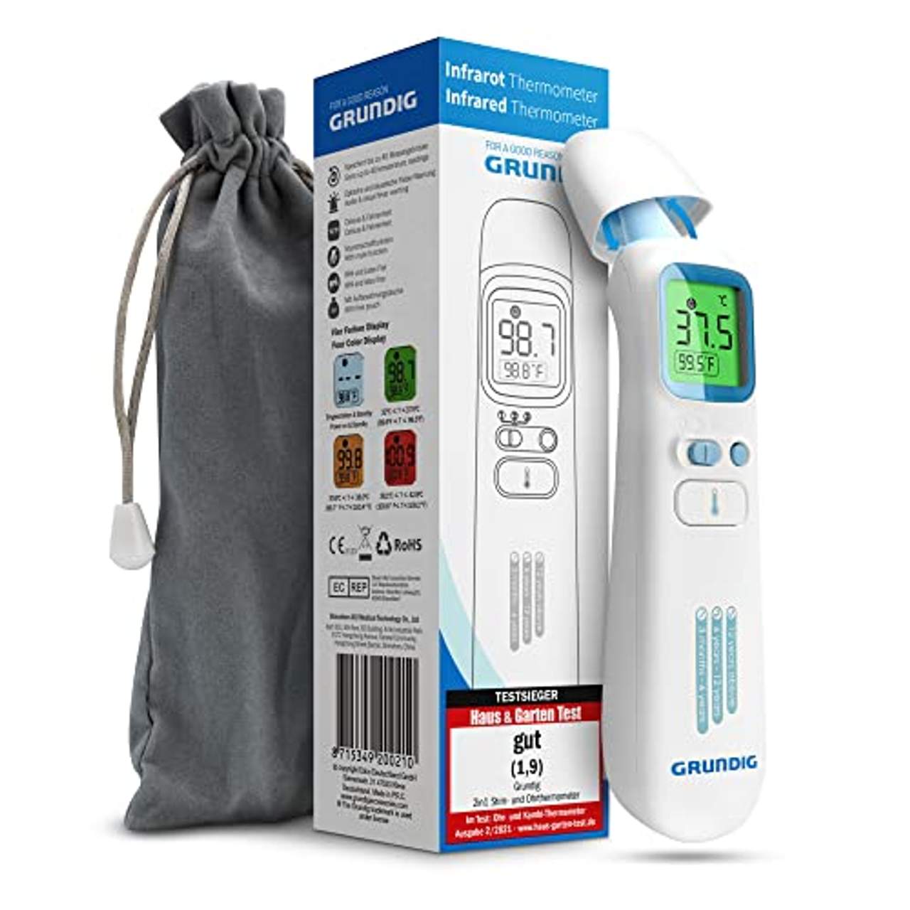 - Testsieger: Das Grundig Fieberthermometer kontaktlos Infrarot Testsieger wurde von der unabhängigen Testzeitschrift Haus & Garten in ihrer Ausgabe 2/2021 zum Testsieger in der Kategorie Kombi-Thermometer erklärt. Das spricht für die hohen Qualitätsstandards und die exzellente Ingenieurskunst von Grundig und macht es zu einem zuverlässigen und vertrauenswürdigen Produkt.