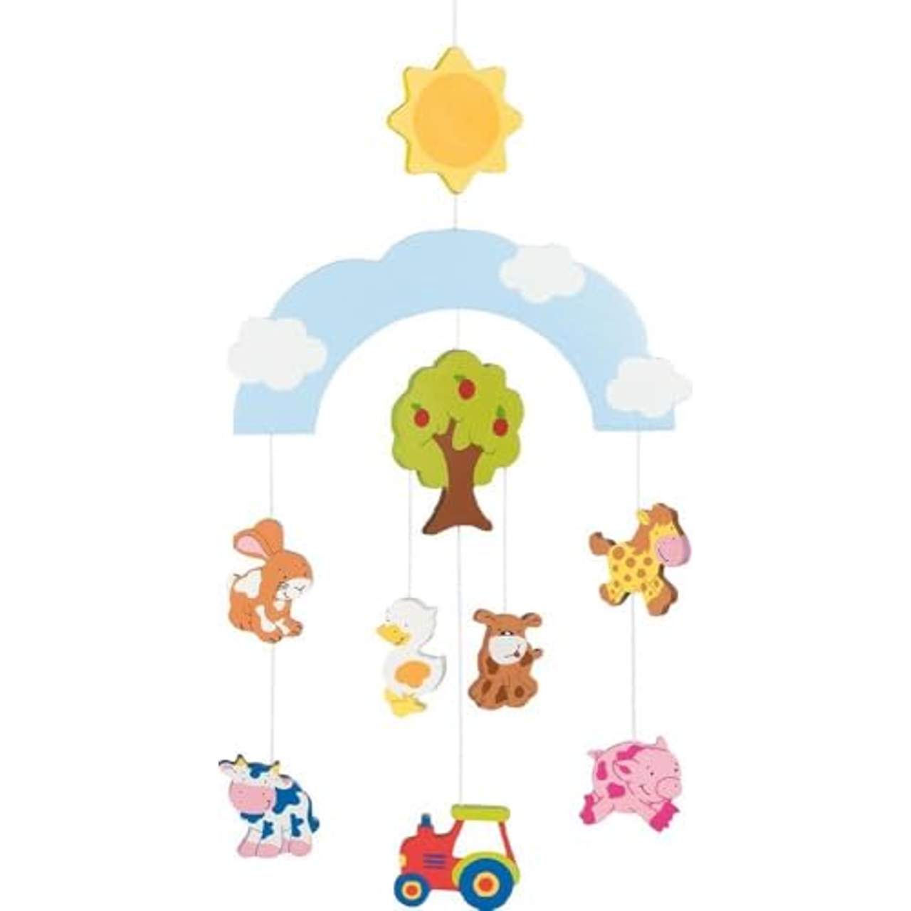 Mobile Bauernhof: 20 x 55 cmWillkommen auf dem Bauernhof! Mit diesem Holz-Mobile wird es im Kinderzimmer nie wieder langweilig. Das Mobile lässt sich mithilfe der Kordel ganz einfach über der Wickelkommode oder dem Kinderbett anbringen und ist ein Highlight in jedem Kinderzimmer.Mit den fröhlichen Farben ist es besonders schön gestaltet. Maße: 29 x 44 cm.