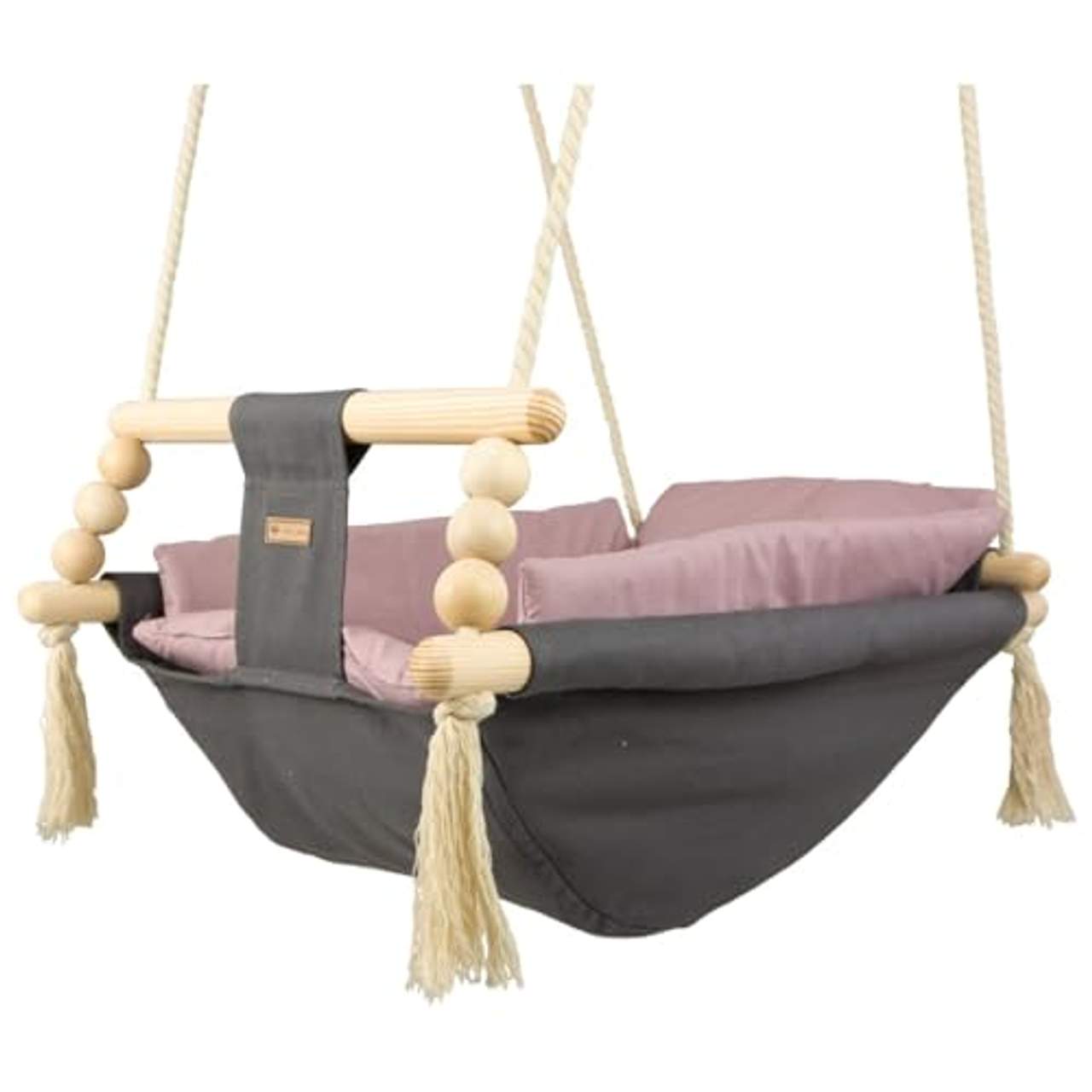 Diese Babyschaukel ist perfekt für Kleinkinder. Sie heißt „Babyschaukel Kleinkindschaukel Babyliegeschaukel Stoffschaukel Babywippe Wiege“ und wird von der Marke Velinda hergestellt. Ihr einzigartiges Design ermöglicht es Babys, sowohl im Liegen als auch im Sitzen zu schaukeln. Dabei vermittelt sie ein vertrautes Gefühl, das dem des Mutterleibs ähnelt, während die Vibrationen sie beruhigen. Die Wiege besteht aus natürlichen Materialien wie Holz und Baumwolle, die frei von Schadstoffen sind, und hat einen weichen Sitz, der für Komfort sorgt. Der Winkel des Sitzes kann je nach Alter und Bedürfnissen deines Kindes von der Liege- bis zur Sitzposition eingestellt werden.