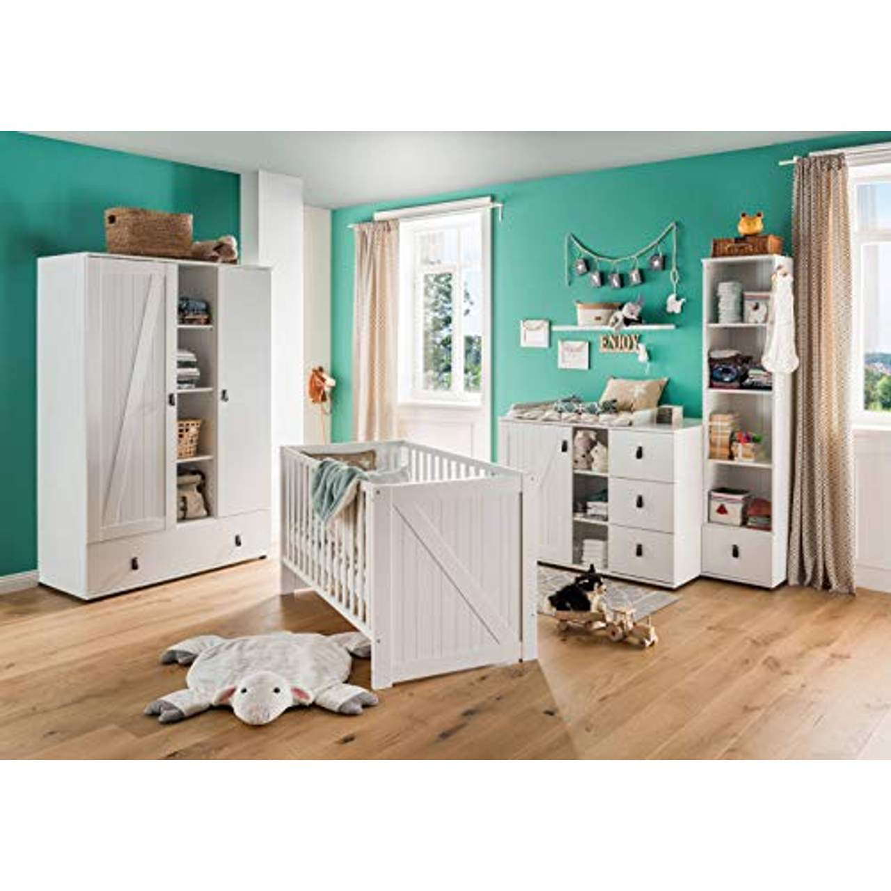 | Umfang | 1 x Kleiderschrank, 1 x Babybett, 1 x Lattenrahmen, 1 x Wickelkommode |