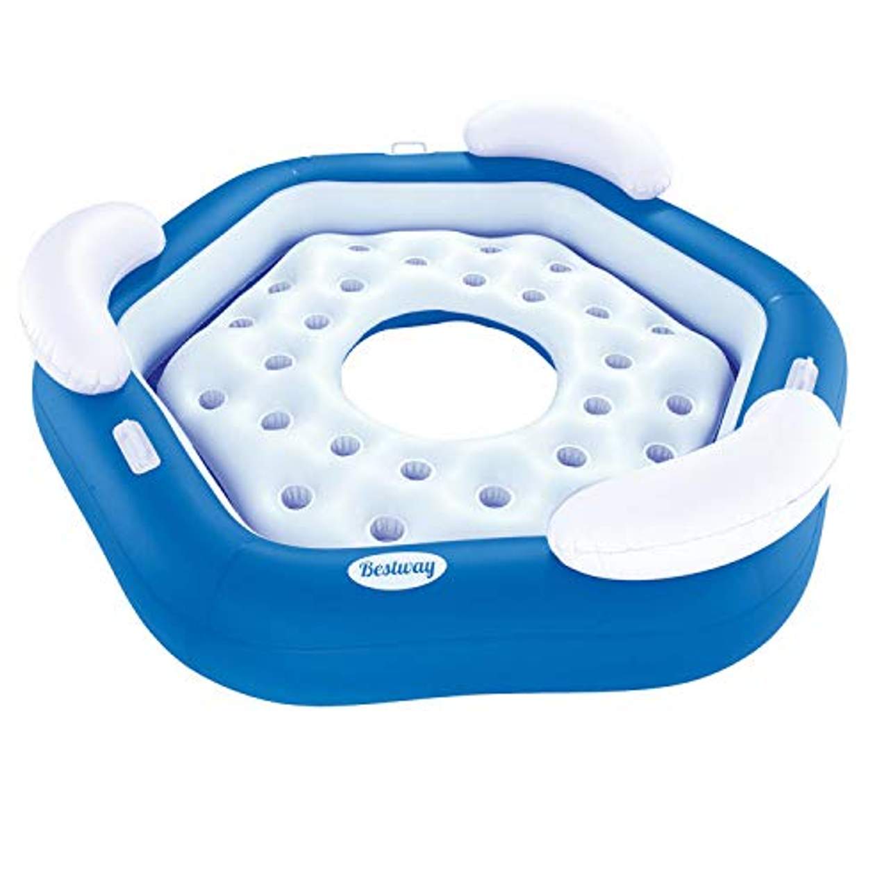 Bestway 43111EU-03 Badeinsel x 3 IslandDiese Bestway Lounge Schwimminsel 43111 für drei Personen ist ideal zum Entspannen im Pool. Aus hochwertigem Vinyl gefertigt, ist diese Lounge-Schwimminsel sehr langlebig. Die Konstruktion mit zylindrischen Streben ist stark genug, um Sie über Wasser zu halten, während Sie Ihre Füße ins Wasser tauchen.Es verfügt über 2 Luftkammern und über starke Griffe. Drei aufblasbare Kissen bieten Ihnen optimalen Sitzkomfort. Die aufblasbare Schwimminsel kann leicht aufgeblasen und entleert werden. Genießen Sie ultimative Entspannung und Komfort mit dieser Lounge Schwimminsel! Spezifikationen: Farbe: Blau/Weiß Stabile Vinyl-Coil-Beam-Konstruktion Maße: 191 x 178 cm (L x B) Maximale Belastbarkeit: 270 kg Kapazität: 3 Erwachsene Bestway Artikelnummer: 43111 SKU: 90769