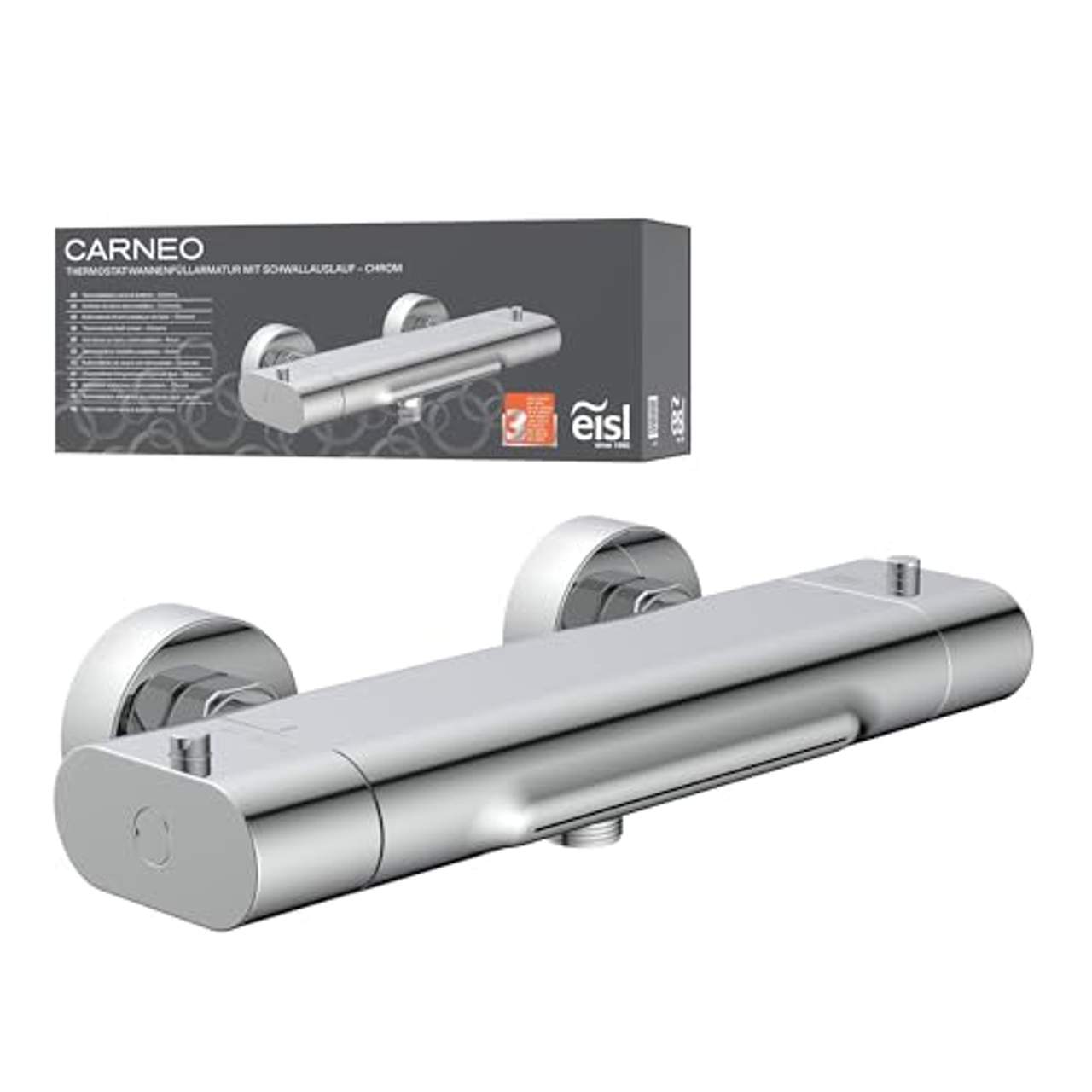 EISL Wannenfüllarmatur CarneoEisl: ProduktdetailsAnschlussart: Hochdruck Kartusche mit keramischer Dichtscheibe: Ja Ausziehbare Brause: Nein Inkl. Wandrosetten: Ja Thermostat: Ja Lieferumfang: Armatur und Montageanleitung Anschlussdurchmesser: 1/2 ZollAnschlussbreite: 150 mmFarbe: chromfarben MaterialMaterial: Messing MaßangabenBreite: 27,2 cmHöhe: 12 cmTiefe: 13 cm