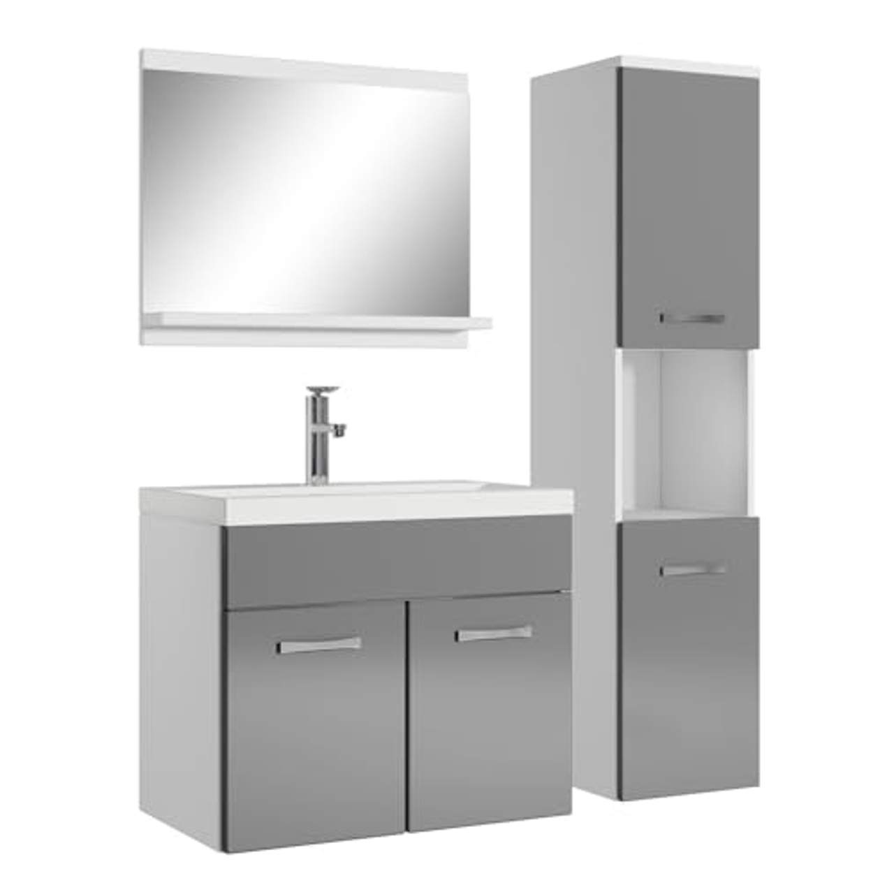 Badezimmer Badmöbel Set Montreal 60 cm Waschbecken HochglanzBadezimmermöbel Montreal Badezimmermöbel Montreal ist ein 4-teiliges Badezimmerset. Dieses Set besteht aus einem Waschbecken, einem Waschbeckenunterschrank, einem Hochschrank sowie einem Spiegel. Sowohl der Waschbeckenunterschrank als auch der große Hochschrank sind mit zwei Drehtüren ausgestattet. Der Hochschrank hat ein offenes Fach in der Mitte und kann sowohl links als auch rechts platziert werden.Der Spiegel wird mit einem zusätzlichen Ablage geliefert. Dieser Betrag gilt für das Set, inklusive Spiegel und Hochschrank, aber ohne Wasserhahn, Abfluss und Siphon. Farbe: Hochglanz Grau Fronts Die Möbel dieses Sets werden zur Selbstmontage geliefert, einschließlich alle erforderlichen Befestigungen und klare Anweisungen.Materialien Das Waschbecken ist aus künstlichem Marmor hergestellt und wird mit dem dazugehörenden Überlauf geliefert. Der Waschbeckenunterschrank, Hochschrank und Spiegel sind aus Spanplatten hergestellt. Maße (Breite x Länge x Höhe) Waschtisch: 600 x 350 x 50 mm