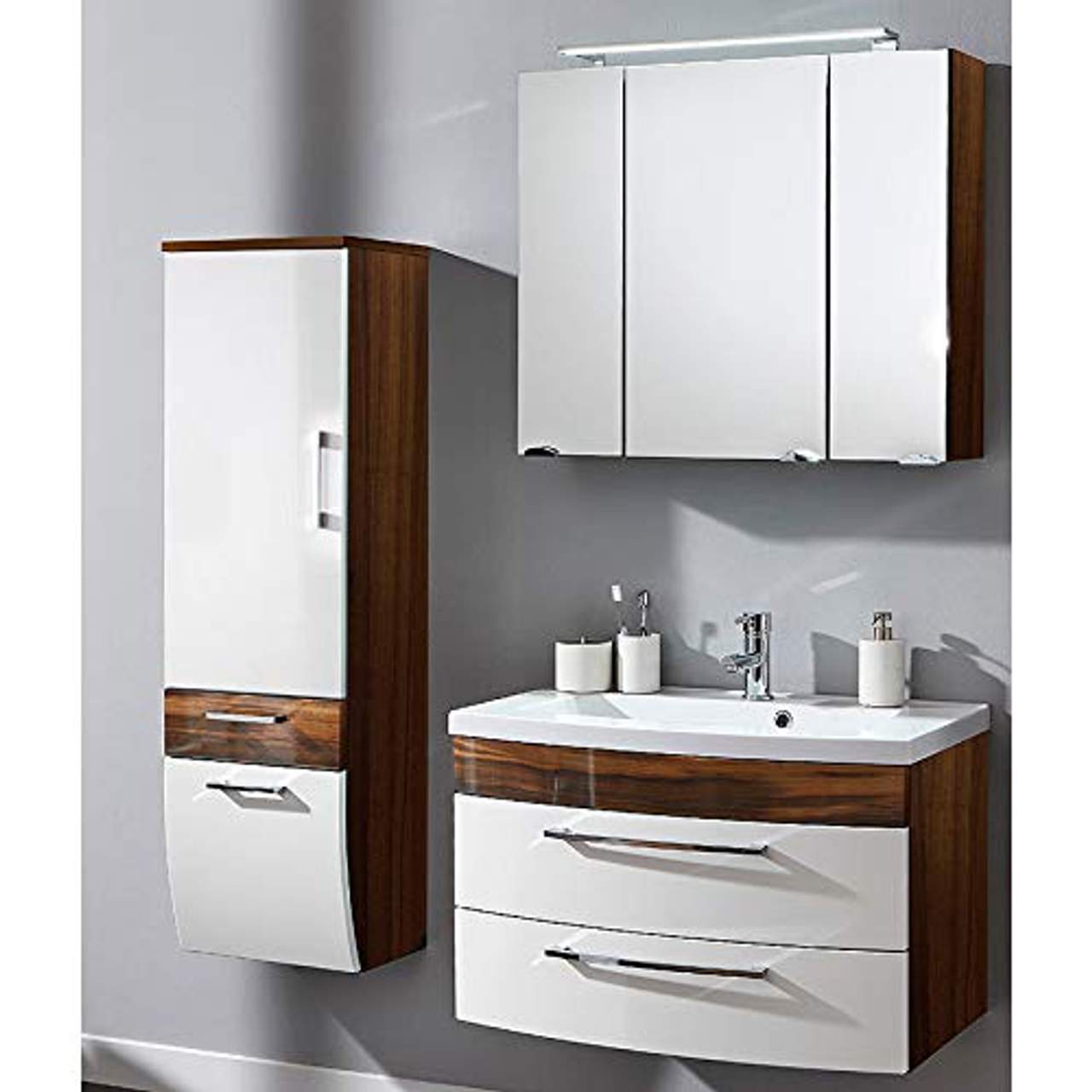 Badezimmermöbel Set Hochglanz Badmöbel Waschtisch LED SpiegelschrankMaterialdaten Oberflächen: Korpus: melaminbeschichtet, Walnuss Nachbildung Fronten: MDF-Fronten; Hochglanz weiß, Walnuss Nachbildung Griffe: Metall, verchromt Auszüge-Waschtisch: Softclose-System Türen: mit komfortabler Dämpfung Lieferumfang Produktinformationen Maßangaben:: 1x Badmöbel Set bestehend aus: Spiegelschrank: 3 Spiegeltüren, 6 Glaseinlegeböden, LED Beleuchtung, Schalter-/Steckdosenkombi, B x H x T: ca. 80 x 68 x 20 cm Waschtisch: 2 Vollauszug-Schubkästen mit Softclose, Mineralgussbecken, B x H x T: ca. 82 x 54 x 48,5 cm Hochschrank: 1 Tür (Türanschlag re oder li), 2 Glaseinlegeböden, 1 Schubkasten, 1 Klappe, B x H x T: ca. 40 x 134,5 x 30 cm Gesamtmaß B x H x T: ca. 142 x 190 x 48,5 cm (inkl. jeweils 20cm Zwischen- und Bodenabstand) Details Qualitätsmerkmale: hochwertige Melaminharzbeschichtung Schubkästen mit kugelgelagerten Metall-Teilauszügen strapazierfähige und unempfindliche Oberflächen hohe Kratz- und Stoßfestigkeit Metallscharniere und -beschläge Qualitätsmöbel Made in Germany Montage Lieferung: Lieferung erfolgt zerlegt einfache bebilderte Montageanleitung schneller Aufbau durch intelligente Konstruktion Lieferung erfolgt per Paketdienst Weitere Hinweise Badezimmermöbelset mit hochglänzenden tiefgezogenen MDF-Fronten.Korpus melaminbeschichtet. 80cm Waschtischunterschrank, 2 Softclose-Vollauszügen inkl. Mineralgussbecken, Schubkasten mit Siphonausschnitt 80cm Spiegelschrank: 3 Spiegeltüren, 6 Glaseinlegeböden, LED Beleuchtung, Schalter-/Steckdosenkombi hochwertige Metallbeschläge, Softclose-System, verchromte Metallgriffe, komfortable Türdämpfung, MDF-Fronten Badmöbel komplett zerlegt im Karton, zum Selbstaufbau inkl. bebilderter Montageanleitung. Qualität Made in Germany
