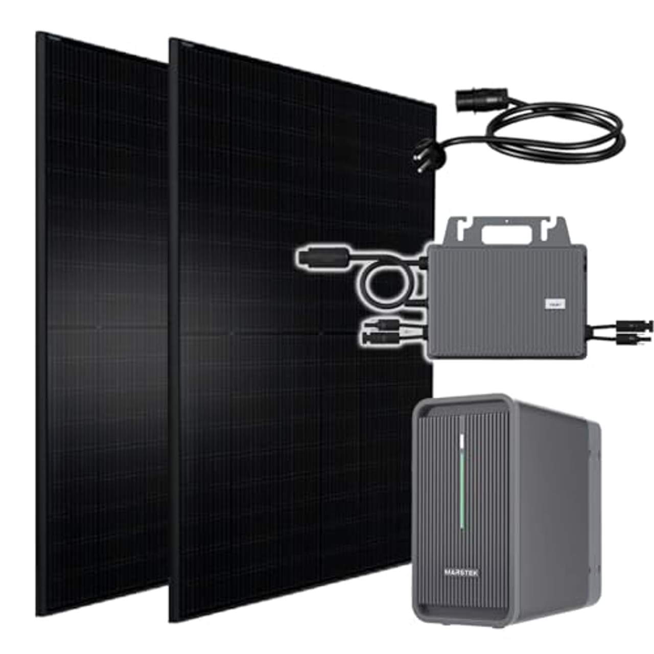 | Lieferumfang | 2x 500W Bifazial Vollschwarz Solarmodule, 1x TSUN Wechselrichter mit 5m Schukokabel, 1x Marstek Speicher B2500 mit 4x 2m …mehr |