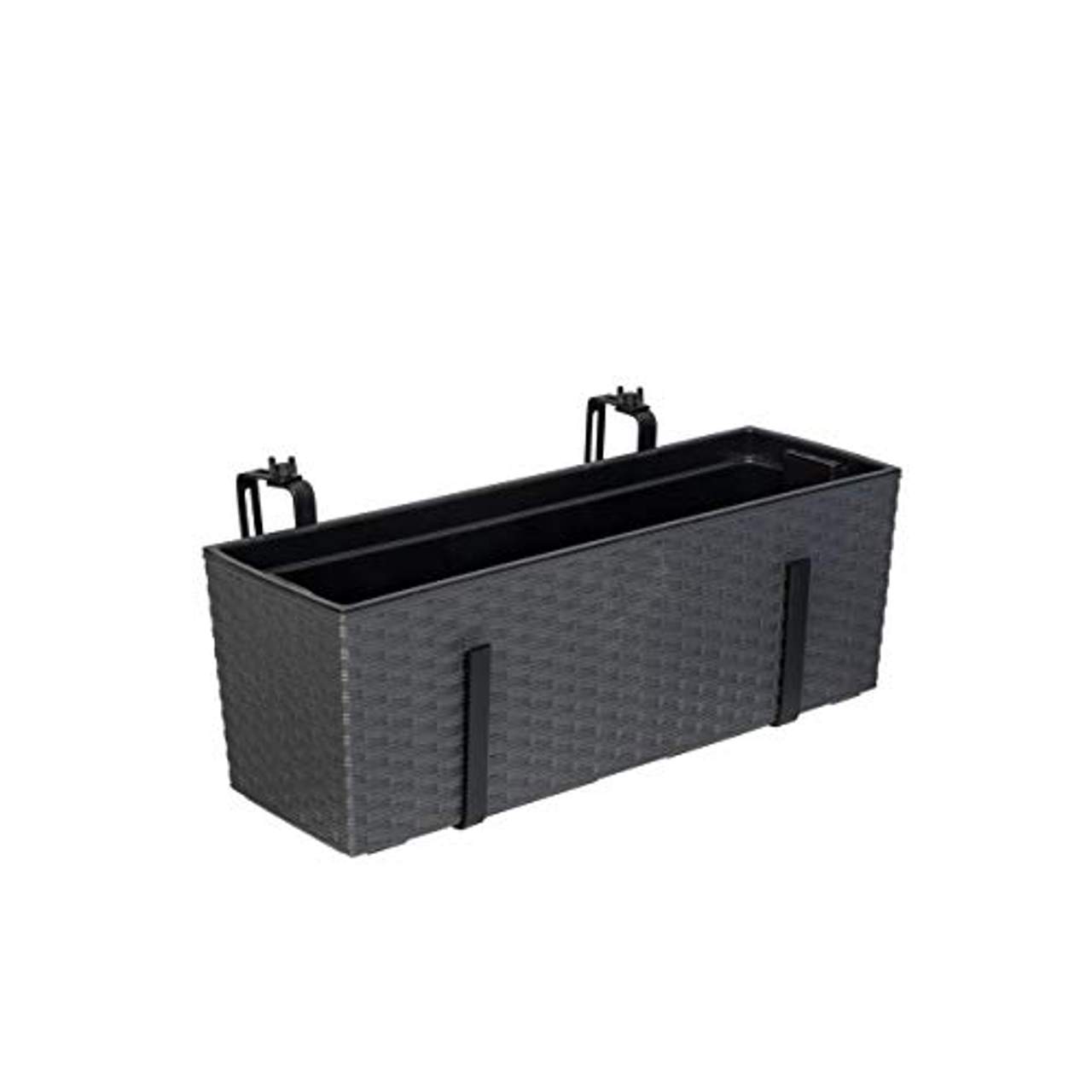 Kreher XL Balkonkasten PflanzkastenSie wollen Ihren Balkon in ein wahres Blumenmeer verwandeln? Kein Problem! Mit diesen tollen Pflanzkasten in XL Ausführung mit 56 cm Länge und hochwertiger, robuster Stahlaufhängung gelingt Ihnen das im Handumdrehen. Der Pflanzkasten ist aus robustem und UV- und Witterungsbeständigem Kunststoff (PP) gefertigt und besticht durch die hochwertige Optik in topp modernem Rattan-Design.Sie können den Einsatz mit den beidseitig integrierten Hebeschlaufen jederzeit aus dem Rattan Kasten nehmen, selbst im bepflanzten Zustand, und diesen als „,Stand-Alone“, Topf auf dem Tisch, der Veranda oder der Fensterbank platzieren. In dem tollen Format von 56 x 18,5 x 19,5 cm lässt sich der Topf an vielen Stellen verwenden und wirkt edel, aber nicht zu aufdringlich. Am Boden des Einsatzes befinden sich Aussparungen, sodass sich die Wurzeln Ihrer Pflanzen kontinuierlich am überschüssigen Wasser bedienen können.Falls dies im Hinblick auf Staunässe nicht erwünscht ist, lässt sich der Rattan Kasten auch ganz einfach mit Löchern versehen, sodass das Wasser abfließen kann. Ganz besonders toll ist auch die hochwertige Stahlaufhängung, die den Pflanzkasten weit umfasst, wodurch er schön fest sitzt und sicher an Geländern auf einfache und schnelle Art angebracht werden kann.Die Aufhängung lässt sich mittels der Stellschraube auf bis zu maximal 10 cm in der Breite verstellen.