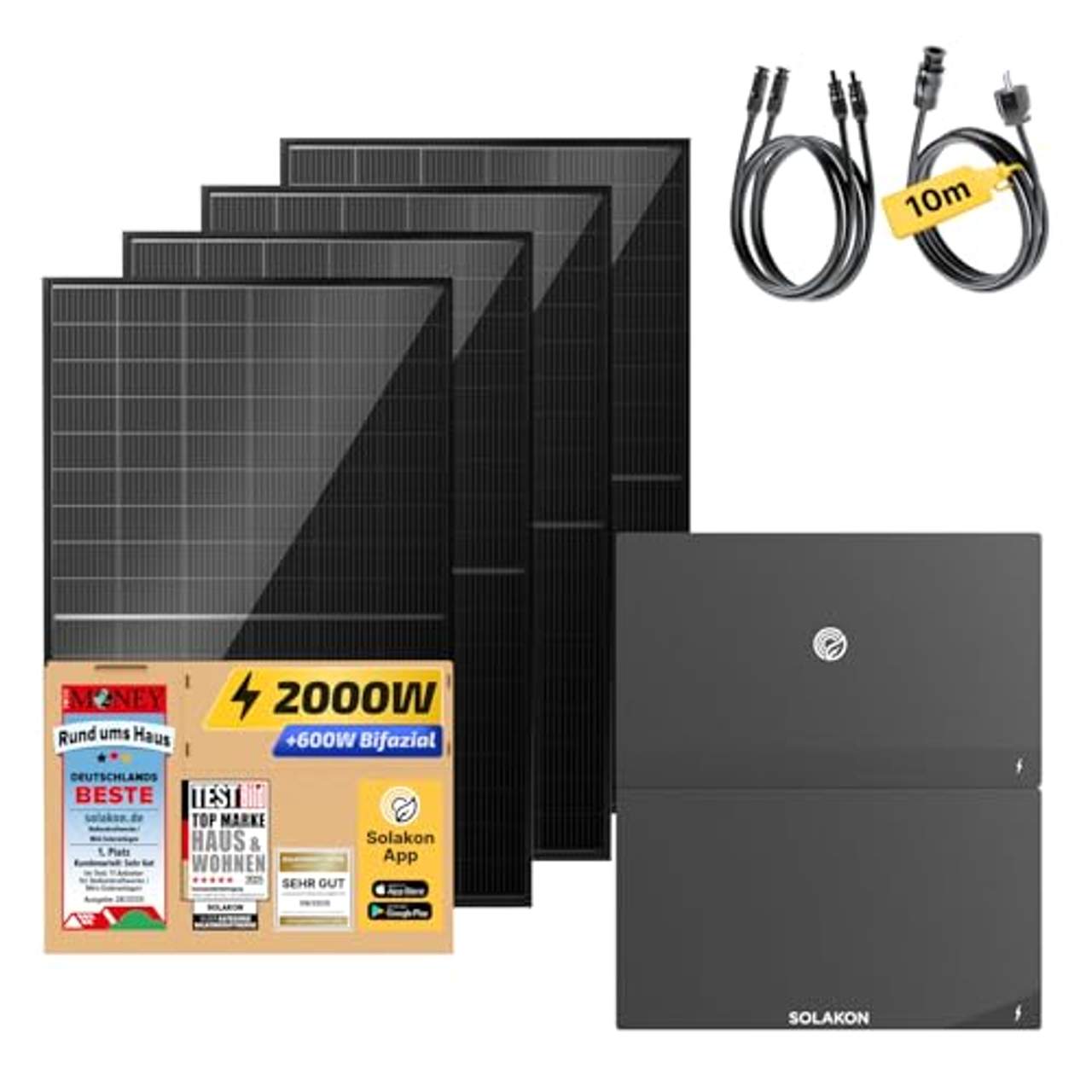 | Lieferumfang | 4x bifaziale 500W Tongwei TWMNH54HD Solarmodule, 8x 3,0m DC-Verlängerungskabel, 1x 10m Kabel zur Steckdose, 1x Solakon ONE Balkonkraftwerk Speicher + 1x Erweiterungsspeicher mit 4,22kWh und 800W Integrierten Hybrid-Wechselrichter |
