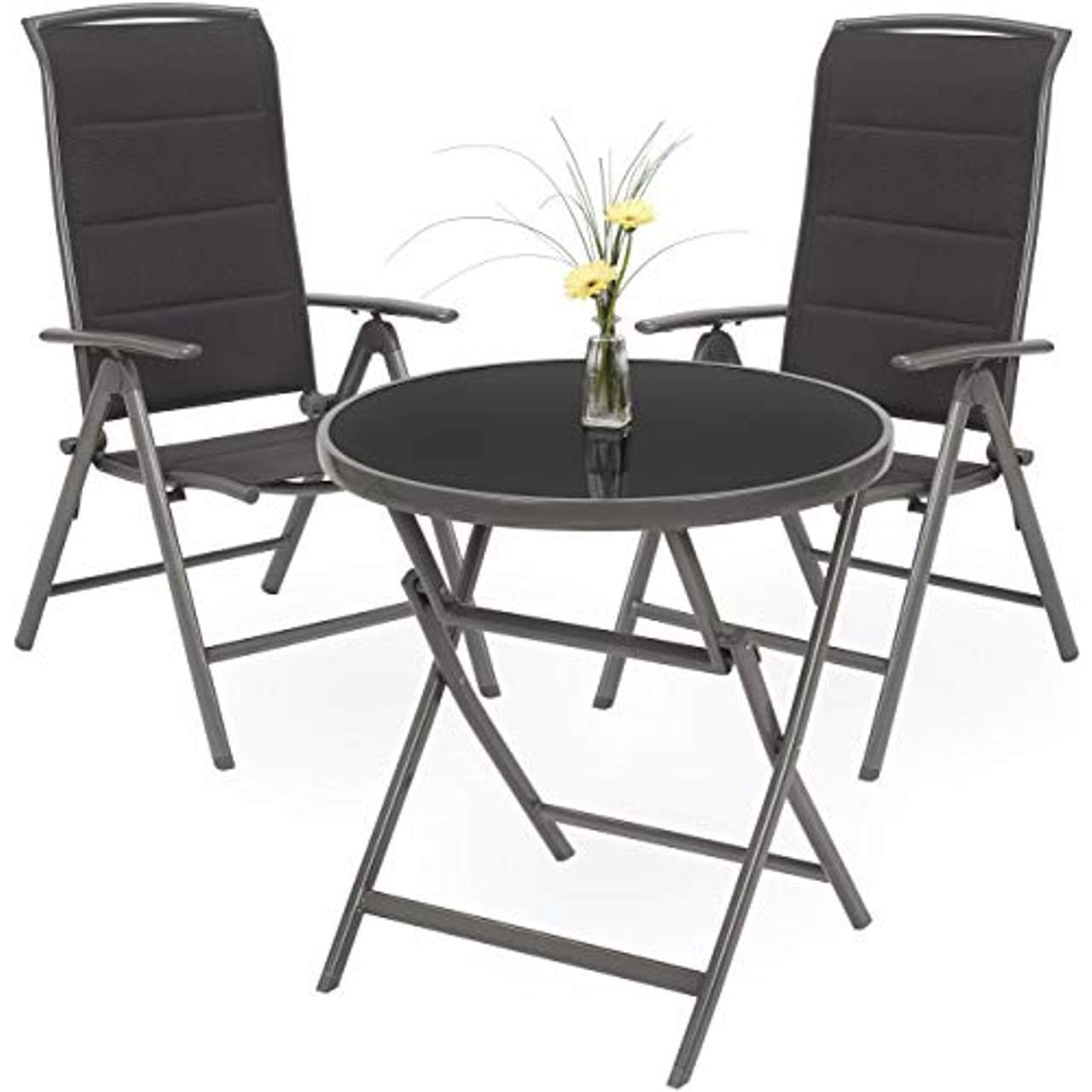 Die Brubaker Garten Sitzgruppe Milano ist ein Balkonmöbel-Set, bestehend aus zwei Hochlehner-Stühlen und einem 70 x 70 cm großen Tisch mit Glasplatte. Der Aluminiumrahmen ist wetterfest und hat wärme- und feuchtigkeitsregulierende Textilbezüge. Die Stühle lassen sich platzsparend zusammenklappen, wiegen jeweils 4,5 kg und sind leicht zu transportieren. Außerdem hat er ein modernes Design, das sich harmonisch in jeden Gartenstil einfügt und ihn zu einem Blickfang macht. Und schließlich steht Ihnen der Kundenservice mit Rat und Tat zur Seite.