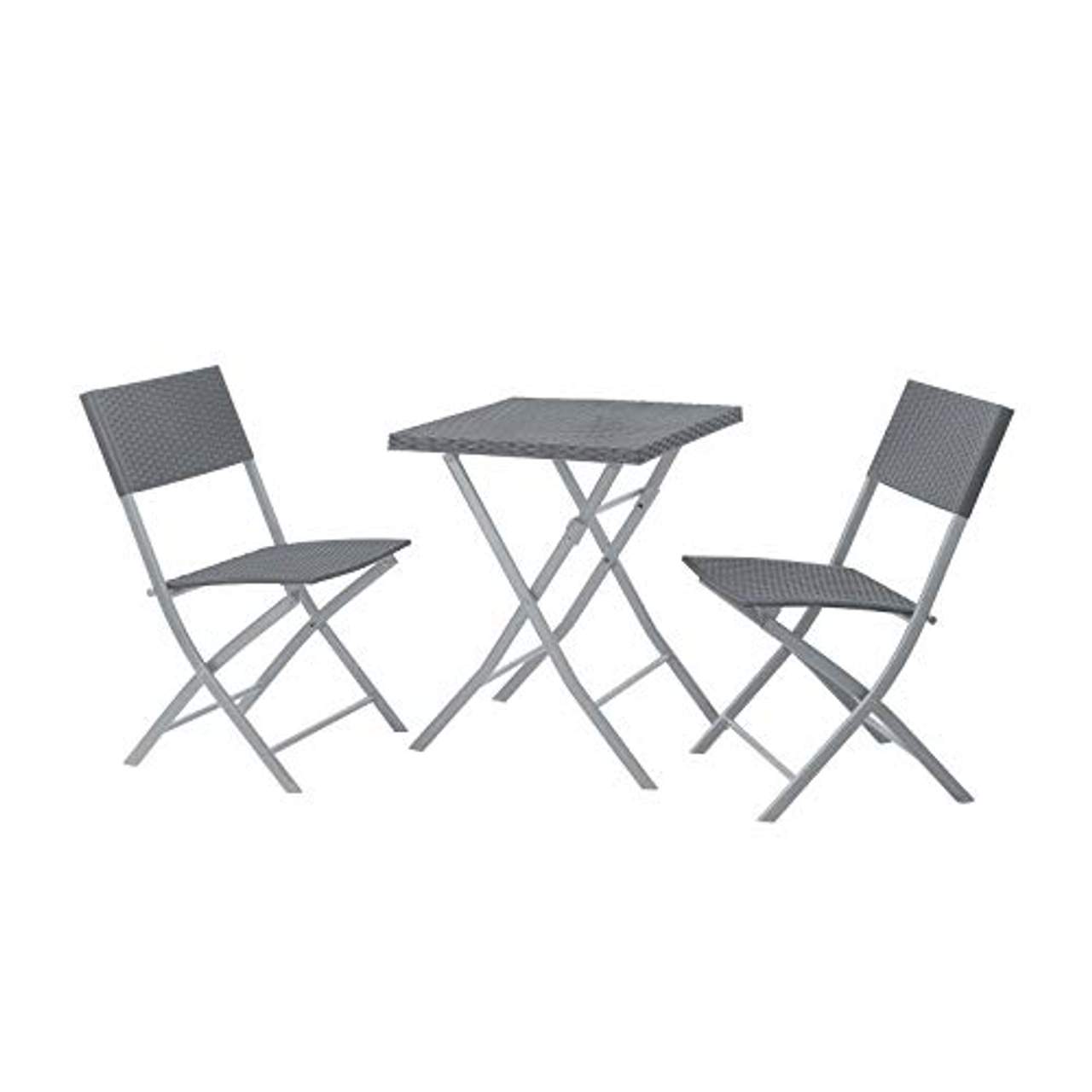 SVITA Poly-Rattan Bistro-Set Tisch Stuhl Balkon-Set KlappbarSVITA Polyrattan Balkonmöbel - 3er Set inkl. 2x Stuhl und 1x Tisch in schwarz oder grau - klappbare Metall-Möbel mit Polyrattan Elementen - Diese SVITA Balkongarnitur besteht aus zwei klappbaren Stühlen und einem quadratischem Klapptisch. Dank der klassischen Polyrattan-Geflecht Optik, lässt sich dieses Set mit jeglicher Einrichtung sehr gut kombinieren. Die Outdoor-Möbel sind UV-beständig und lassen sich bestens zum Camping mitnehmen oder auf Balkon, Terrasse, Wintergarten oder im Garten platzieren.Zusammenklappbar und aus leichtem Kunststoff und Stahl gefertigt, sind die Gartenmöbel nicht nur leicht zu verstauen, sondern zugleich witterungsbeständig und leicht zu reinigen. Die bodenschonenden Kunststoff-Füße bieten zudem einen Schutz Ihrer Bodenbeläge (Kratzschutz). Dank der optimalen Höhe des Tisches, lässt sich hier wunderbar speisen, auflehnen oder Kaffee trinken.Mit diesem 3tlg. Bistro Set können Sie auch ohne viel Platz wunderbar Zeit im Freien verbringen! Tisch: ca. 58 x