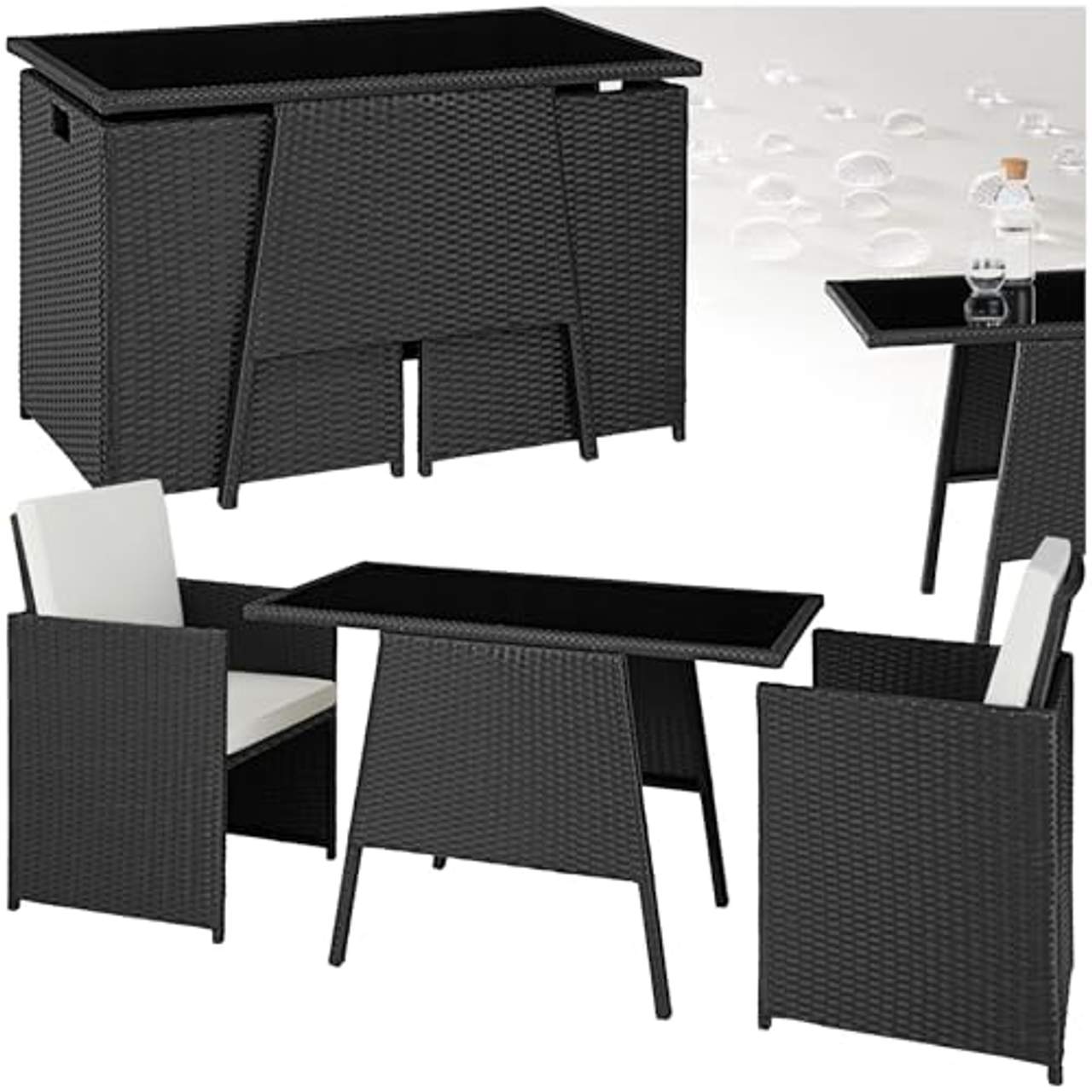 - Elegantes Aussehen: Mit ihrer schwarz glänzenden Tischplatte aus Sicherheitsglas und dem geschmackvoll gemusterten Geflecht bietet die TecTake 800682 Polyrattan Sitzgruppe einen attraktiven und stilvollen Look für jeden Balkon oder jede Terrasse.