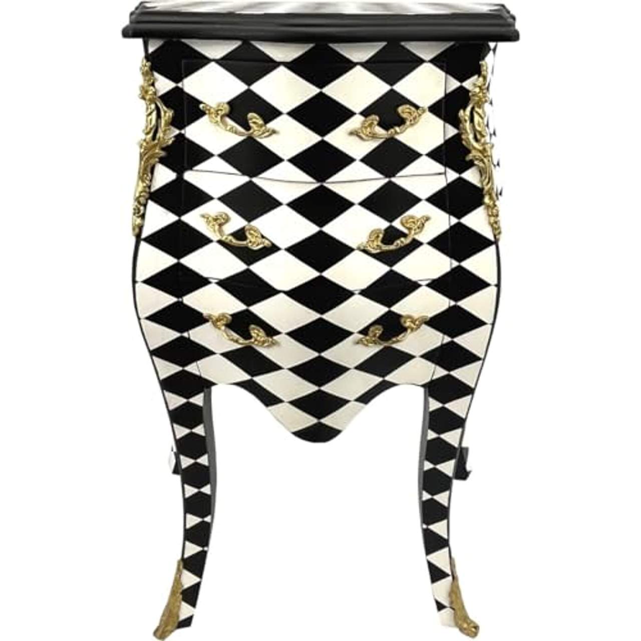Casa Padrino Barock Kommode Karo Design SchwarzBarock Kommode mit Karo Design und 3 Schubladen von Casa Padrino Material: Massivholz, MetallBreite ca.: 55 cmTiefe ca.: 35 cmHöhe ca.: 73 cmFarbe: schwarz / weiß / goldHandgefertigtWirkt sehr elegant und edelAus der Barock Möbel Kollektion von Casa Padrino! Dieser Artikel ist ein authentisch handgefertigtes Antik Stil Replikat. Farbabweichungen, kleinere Risse, Farbabplatzungen, Antikspuren, Unebenheiten und andere Antikstil Merkmale sind Teil des Artikels und machen jedes Möbelstück zu einem Unikat.Sie kaufen ein Produkt der Marke Casa Padrino.Casa Padrino ist ein europaweit renomierter Produzent und Vertrieb von Barock Möbeln undein eingetragenes Warenzeichen beim deutschen Patent und Markenamt.