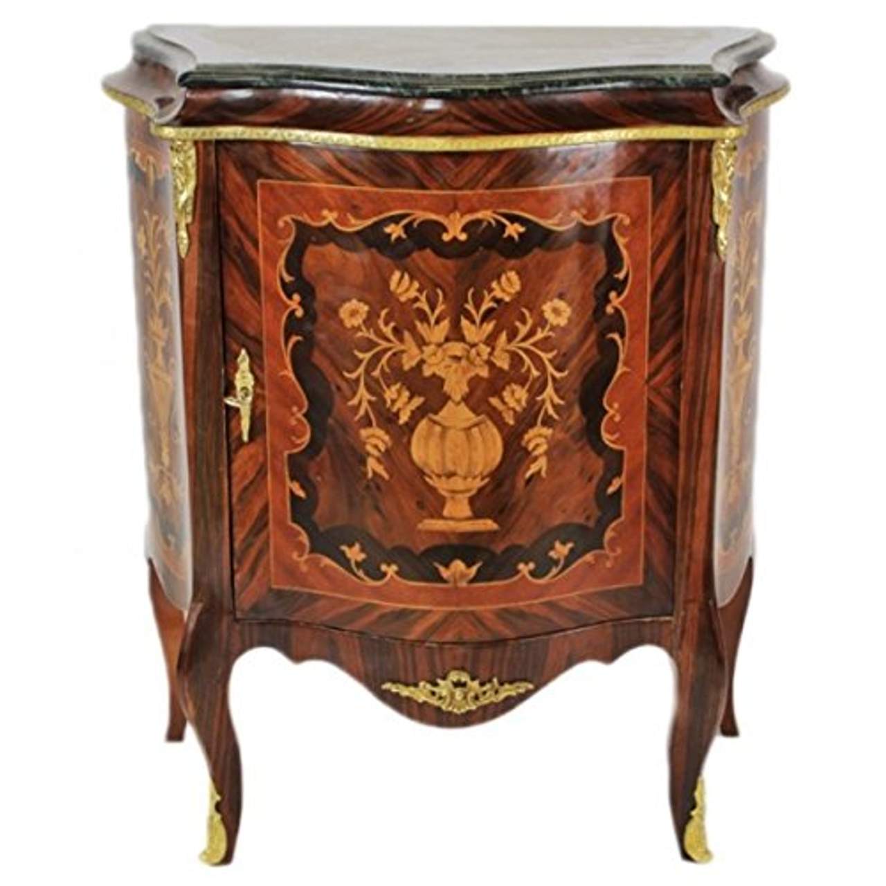 Breite 75 cmTiefe: 40 cmHöhe 85 cmFarbe: MahagoniDesign: BarockMaterial: Holz, MetallgriffeMarmorplatte in Dunkelgrünmassive QualitätEin echter Hingucker für ein stilvolles Wohnambiente!