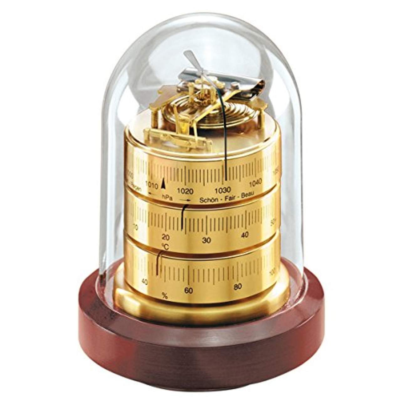 Barigo Wetterstation barometer thermometer/hygrometerDurch präzise Messung von Luftdruck, Luftfeuchtigkeit und Temperatur informiert uns die Barigo Wetterstation über bevorstehende Änderungen der Wetterverhältnisse. Die aus Messing gefertigten Skalen der Barigo Wetterstation sind übereinander auf einem Sockel aus mahagonifarbenem Holz angeordnet und von einer Kuppel aus Acryl umgeben.So ist die Barigo Wetterstation nicht nur funktional, sondern auch ein schönes Accessoire im Wohnraum. Barigo - Qualität und Langlebigkeit zum Anfassen Die Firma Barigo wurde 1926 gegründet und ist einer der führenden Hersteller mechanischer Wetterinstrumente. Die Marke Barigo hat ihren Ursprung in der feinmechanischen Industrietradition des Schwarzwaldes. Alle mechanischen Geräte werden sorgfältig von Hand montiert, geprüft und justiert.Die Erfahrung der Mitarbeiter und umfangreiche Kontroll- und Meßeinrichtungen garantieren höchste Fertigungsqualität und einen gleichbleibend hohen Qualitätsstandard. Bei Barigo beginnt Qualität bei der Selektion der Werkstoffe. Das Spektrum reicht von höchst modernen Kunststoffen bis hin zu Materialien, die seit Jahrhunderten im maritimen Instrumentenbau Verwendung finden.So zum Beispiel der Materialmix aus Mahagoni und Messing, der seine großartige Widerstandsfähigkeit auf allen Weltmeeren unter Beweis gestellt hat.