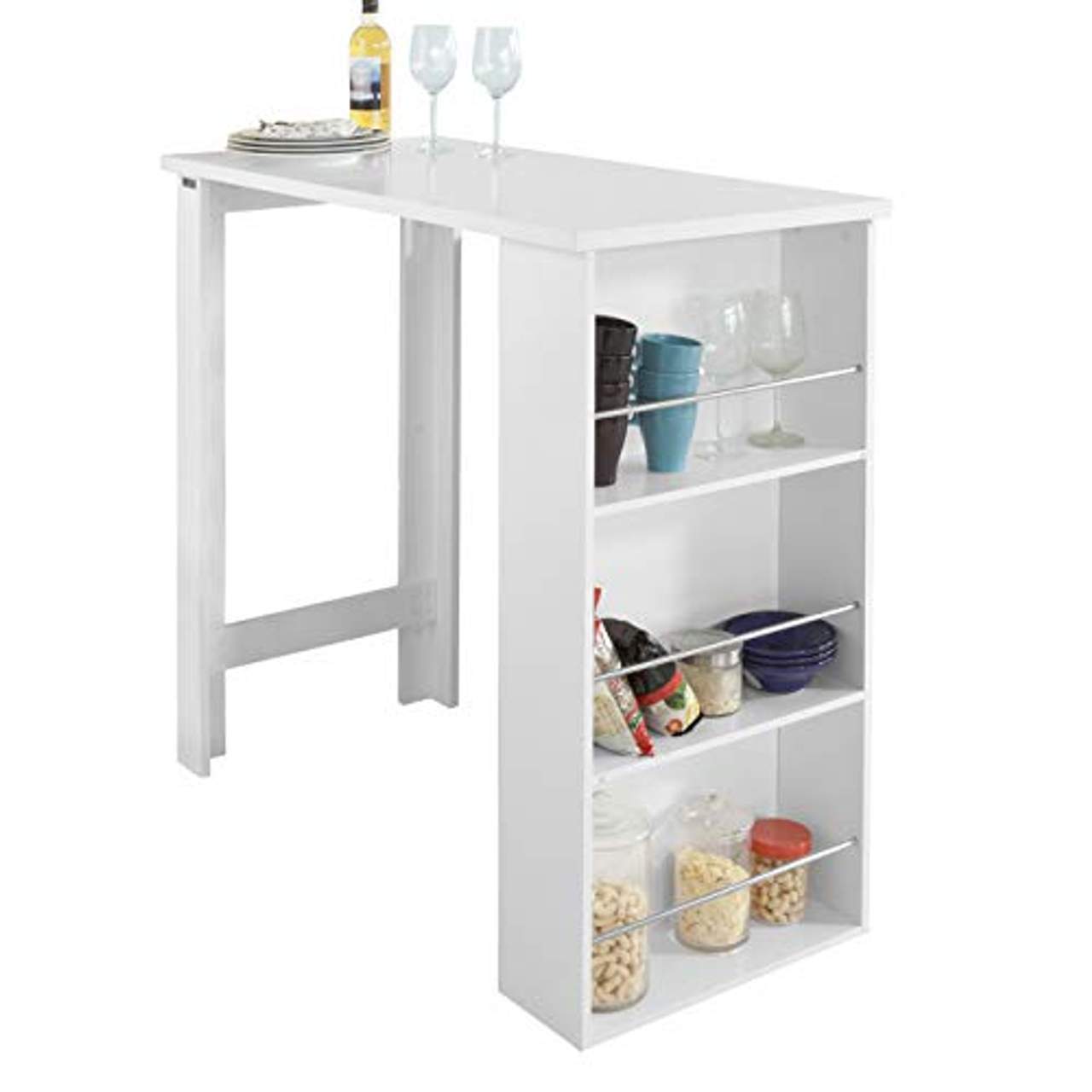 SoBuy Bartisch FWT17-WDieser moderne Stehtisch ist eine perfekte Alternative für kleine Wohnungen mit begrenztem Platzangebot. Mit dem zeitgemäßen Design ist der Tisch eine schicke Ergänzung zu Ihrer Küche oder Ihrem Esszimmer.Dank der 3 Ablagefächer bietet der Bartisch genügend Stauraum für Ihre Gläser, Wein- oder andere Sache. So haben Sie für Ihre Gäste immer das passende Getränk zur Hand.Ob für Ihren heimischen Barbereich oder als moderner Esstisch für Ihre Küche, an diesem stilvollen Bartisch lässt sich angenehm die Zeit verbringen.Der Bartisch lädt zum längeren Verweilen ein - genießen Sie ein ausgiebiges Frühstück oder ein abendliches Glas Wein mit Freunden!Bei uns im Shop haben Sie die Möglichkeit weitere Bartische zu erwerben.z.B. FWT17-W(weiß); FWT17-SCH(schwarz), FWT39-W(weiß).Kombinierbar mit dem Hocker FST34-Serie: weiß, schwarz, grau, rot oder türkis/ FST35-Serie: weiß, schwarz, oder grauMontage: