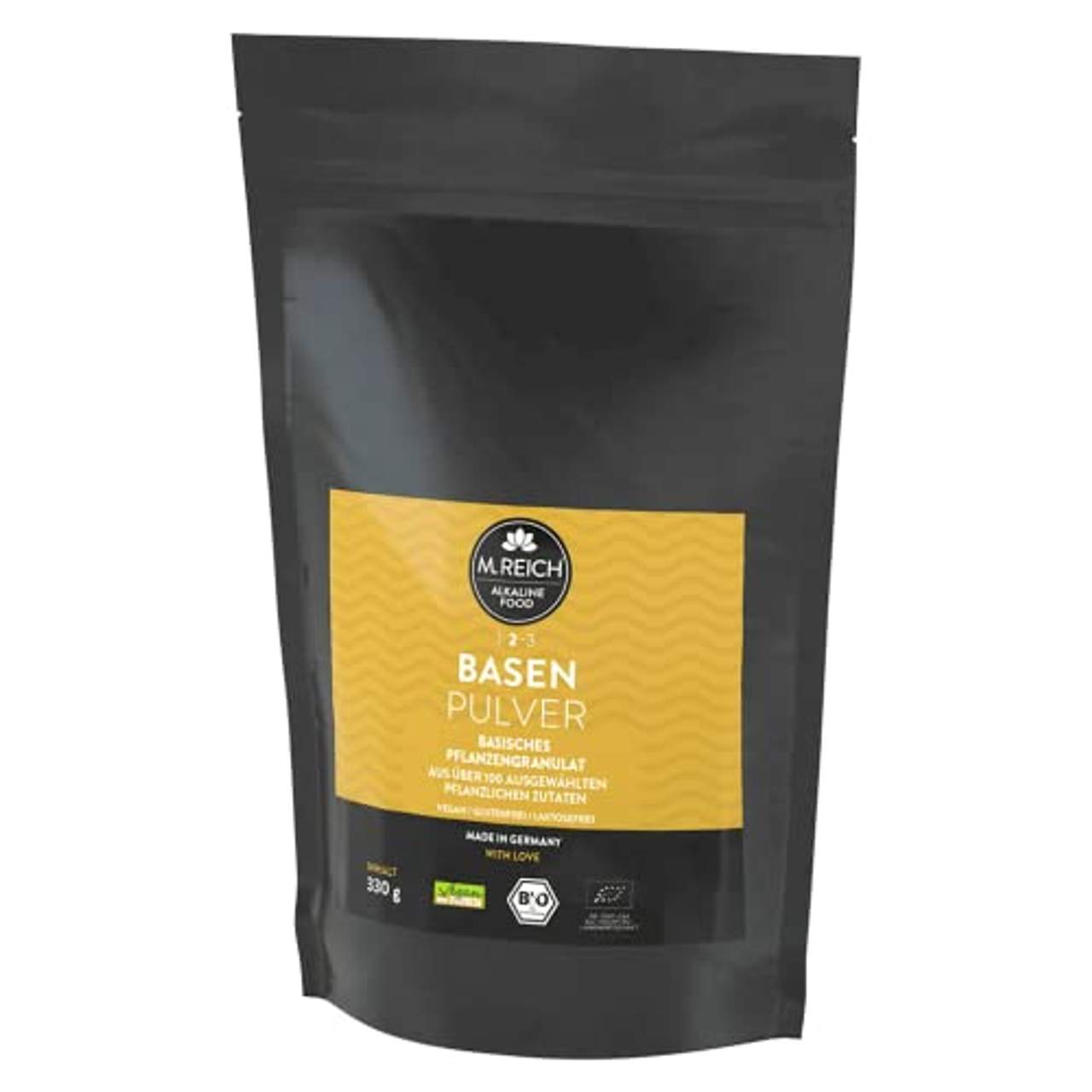 M Reich Basenpulver 330g Bio VeganBasisches Pulver aus 107 hochwertigen Bio-Zutaten Wertvolle Vitamine, Mineralstoffe und Spurenelemente aus rein pflanzlichen Zutaten Das basische Pflanzengranulat von M. Reich beinhaltet das Beste aus Obst, Gemüse, Kräutern und Superfoods für die tägliche Versorgung des Körpers mit wichtigen Nährstoffen.Die erlesenen Zutaten wurden schonend getrocknet und verarbeitet, sodass die wertvollen Inhaltsstoffe erhalten bleiben und eine hohe Bioverfügbarkeit gewährleistet werden kann. Der Inhalt ist 100% pflanzlich und komplett frei von unerwünschten und unnötigen Zusätzen und kann bestens während einer Basenkur eingenommen werden.Verwendung Pro Tag wird die Einnahme von drei Teelöffeln empfohlen.„“
