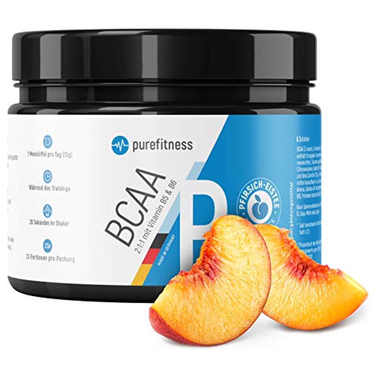 Premium Bcaa Pulver 2:1:1 ist ein Produkt der Marke Purefitness, das essentielle Aminosäuren in einem Eistee-Pulver-Geschmack liefert. Es enthält Vitamin B5 und B6 zur Unterstützung des Energiestoffwechsels, der Steroidhormonproduktion und der geistigen Leistungsfähigkeit. Die Rohstoffe sind von hoher Qualität, während der Herstellungsprozess in Deutschland unter strengen pharmazeutischen Standards durchgeführt wird. Die Qualität wird regelmäßig durch Labortests sichergestellt. Empfohlen wird die tägliche Einnahme von 13 g (ein Messlöffel) dieses Getränks während des Trainings mit 450 ml Flüssigkeit.