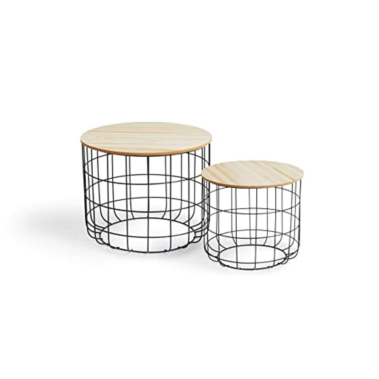 - Einzigartiges Design: Dieses Set aus 2 Beistelltischen besteht aus einem schwarzen Metallrahmen, der einem Drahtkorb oder Metallkorb ähnelt, und einer runden Platte aus MDF-Holz, wodurch ein auffälliges Design entsteht, das Ihre Gäste beeindrucken wird.