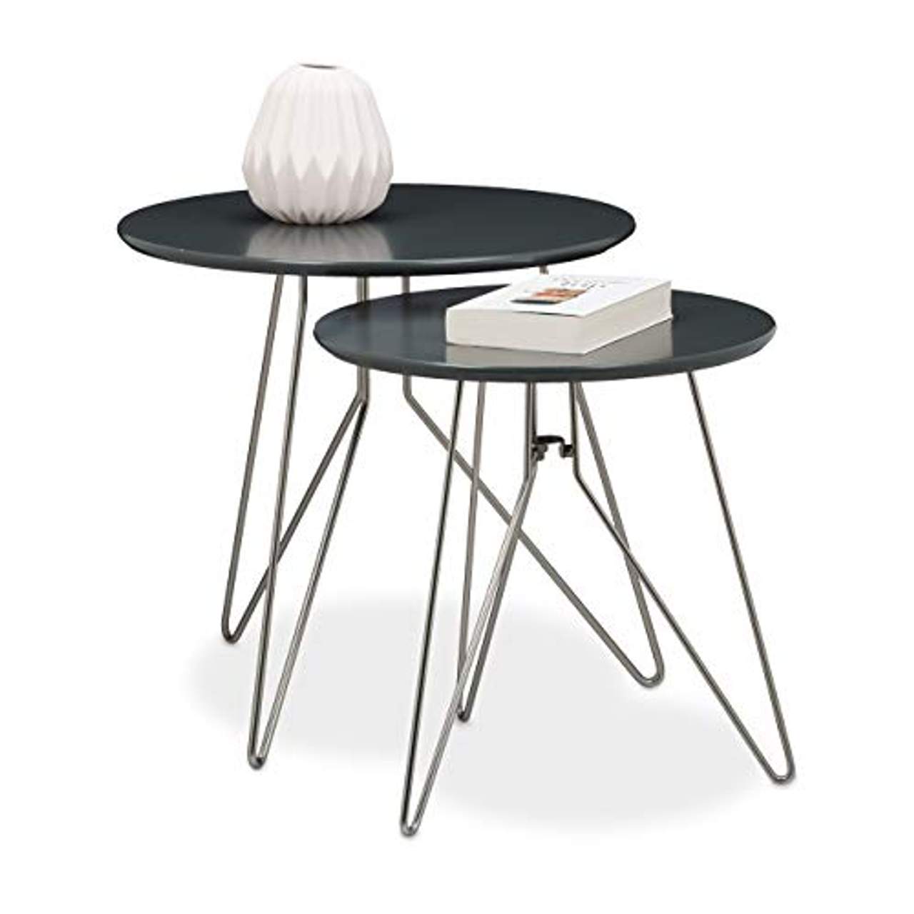 Relaxdays Beistelltisch 2er Set Wohnzimmertische aus HolzMit diesem Tischset können Sie Ihre Einrichtung vielfältig gestalten. Das aus Holz und Metallbeinen bestehende 2er-Set Beistelltische ermöglicht es, praktische und dekorative Abstellflächen für Ihre Wohnung zu schaffen. Wenn Sie mehrere Tische benötigen, ist dieses Set die perfekte Kombination für Sie, um ein einheitliches Wohnambiente zu schaffen.Die Ablagen sind ein moderner und dekorativer Blickfang. Verwenden Sie die Tische als Couchtische in Ihrem Wohnzimmer oder als Ablage in Ihrem Flur. Durch die 3 Metallbeine stehen die Tische stabil und fest. Details des 2-Satz Tisches aus Holz • Tisch groß H x B x T: ca. 44 x 48 x 48 cm (Ø 48) • Tisch klein H x B x T: ca. 40 x 40 x 40 cm (Ø 40) • Tisch groß Gewicht: ca. 3,2 kg • Tisch klein Gewicht: ca. 2,4 kg • Material: MDF Platten mit Furnier und Metallbeinen (Satin Nickel Finish) Tisch 2er Set mit 3 Metallbeinen • Praktisches Tischset bestehend aus 2 Tischen • Stabiler Stand durch Metallbeine • Für unterschiedliche Gelegenheiten und