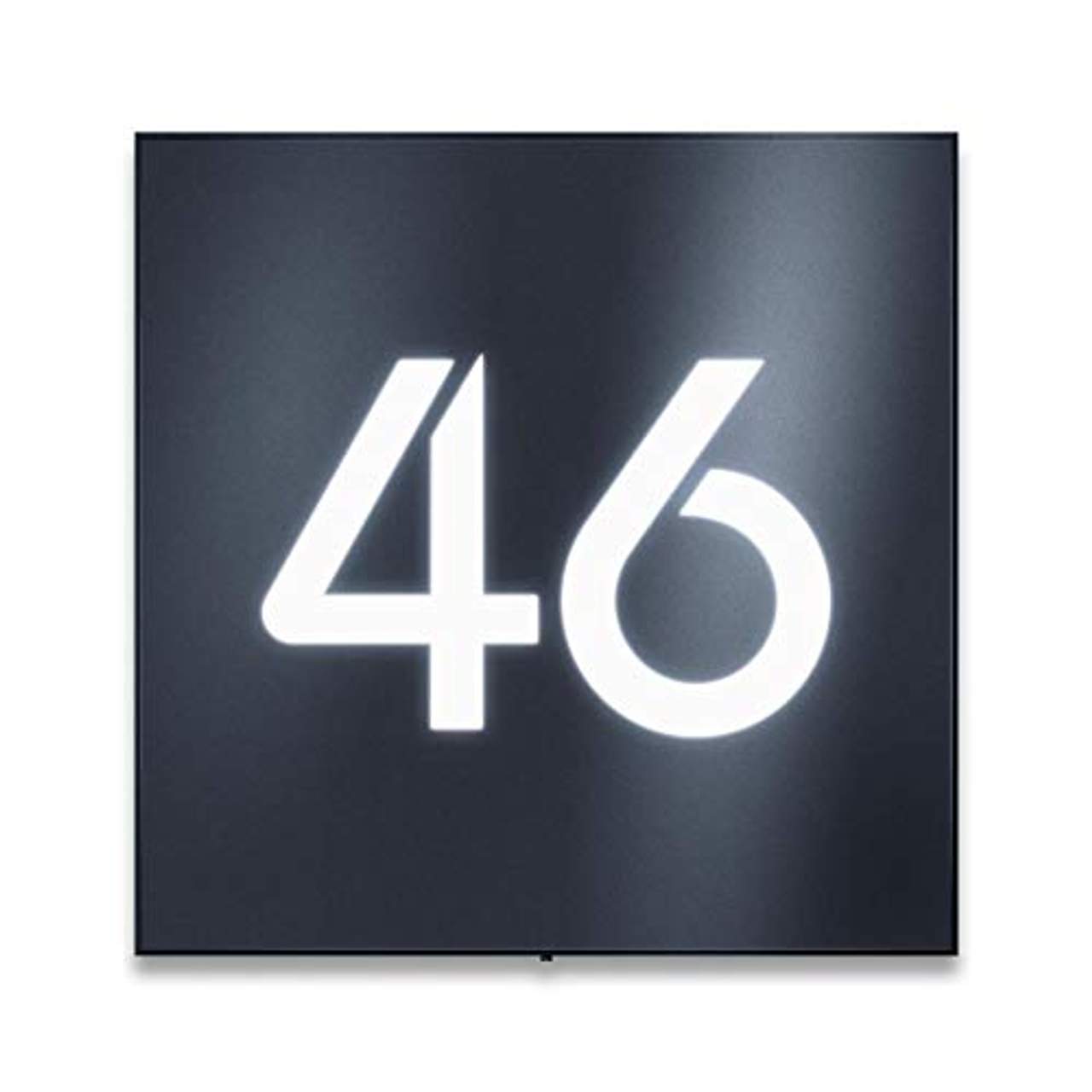 Metzler Hausnummer Edelstahl mit LED-BeleuchtungQuadratisches Hausnummernschild mit LED-Beleuchtung aus Edelstahl in Anthrazit Das Hausnummernschild von Metzler zeichnet sich durch seine flache Bauart (Gesamtstärke nur 10 mm) sowie die energiesparende LED-Beleuchtung (0,5 W) aus. Das quadratische Hausnummernschild besteht aus einem rostfreien Edelstahlkorpus. Im Korpus ist ein energieeffizientes (A++) LED-Panel eingelassen, welches den Ausschnitt der darüber liegenden Ausschnittsplatte in Kaltweiß oder Warmweiß erleuchten lässt. So ist Ihre Hausnummer selbst in der Dunkelheit bestens zu erkennen. Die Frontplatte wird nach dem Auslasern der Hausnummern aufwendig in RAL7016 Anthrazitgrau pulverbeschichtet.Dadurch ist die Hausnummerntafel resistent gegen UV-Strahlung, Wind, Regen und Schnee. Für den Ausschnitt stehen unterschiedliche, einzigartige Schriftarten zur Auswahl. So können Sie Ihre Hausnummer individuell nach Ihren Wünschen gestallten. Eigenschaften: rostfreier, robuster Edelstahl V2A Pulverbeschichtung
