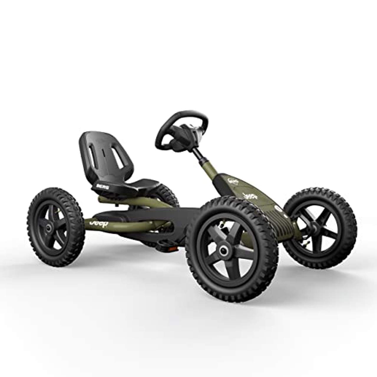 Dies ist ein Gokart von BERG mit dem Namen „Bergtoys Jeep Junior Buddy Pedal-Gokart“. Es ist für Kinder ab 3 Jahren geeignet, mit einem maximalen Benutzergewicht von 50 kg. Es hat einen verstellbaren Lenker und Sattel, vier Räder mit Luftbereifung, eine Rücktrittbremse und einen Rahmen mit Pendelachse. Einzigartig an diesem Gokart ist das BFR-System, das es ermöglicht, nach dem Bremsen sofort rückwärts zu fahren. Es kommt auch mit einer 2-Jahres-Garantie auf den Rahmen vom Hersteller.