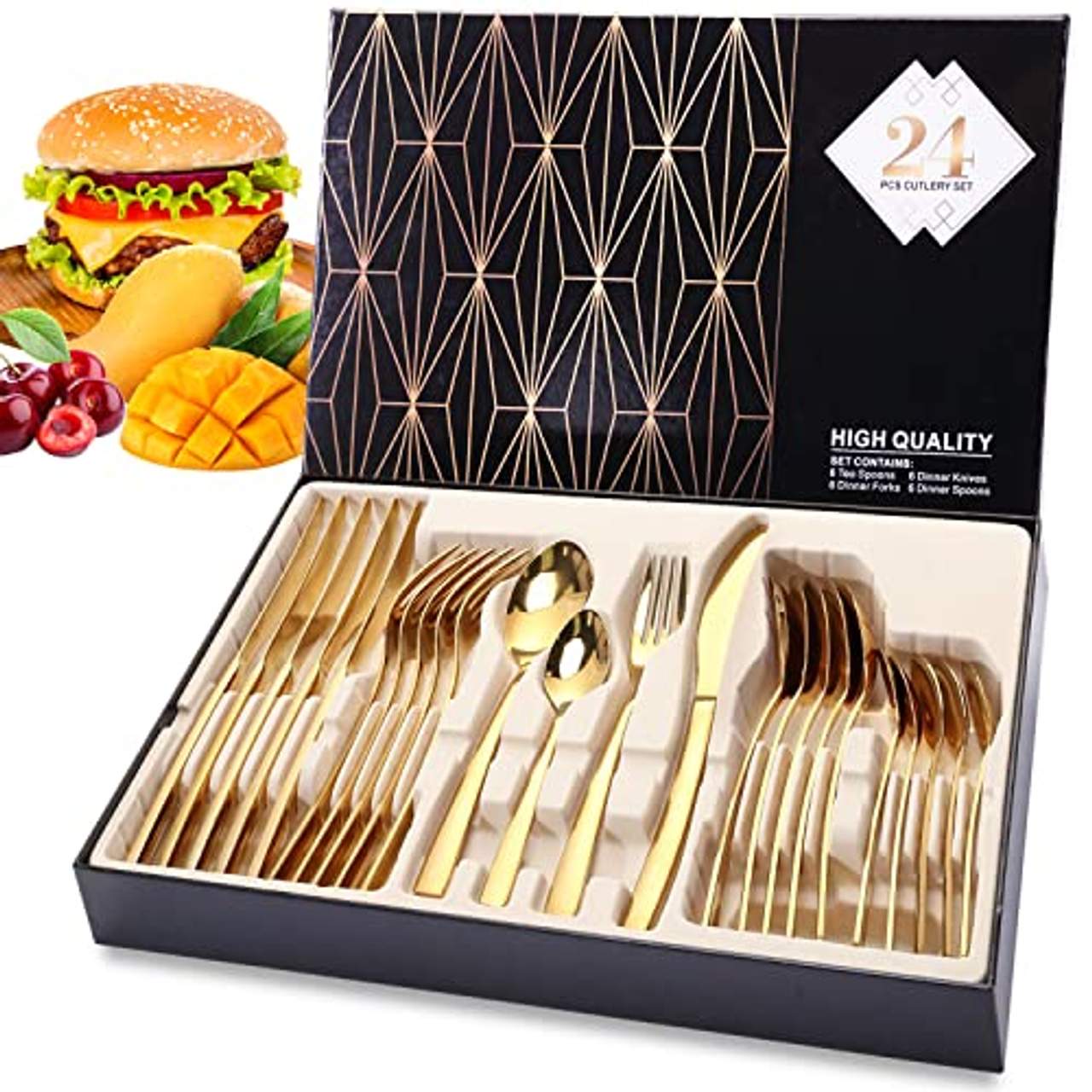 Das HUIKAILI Besteckset Golden enthält insgesamt 24 Teile, was für eine Mahlzeit für 6 Personen ausreicht.