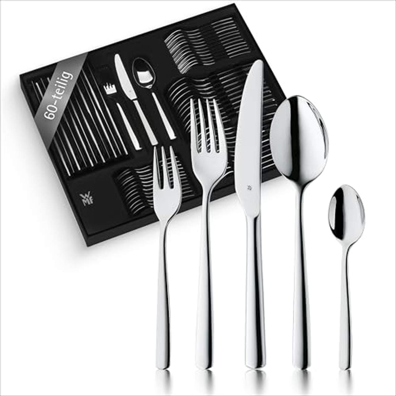 Das WMF Boston Besteckset 60-teilig ist ein umfangreiches Besteckset, das für bis zu 12 Personen geeignet ist und ausreichend Besteck für jeden Gang einer Mahlzeit bietet.