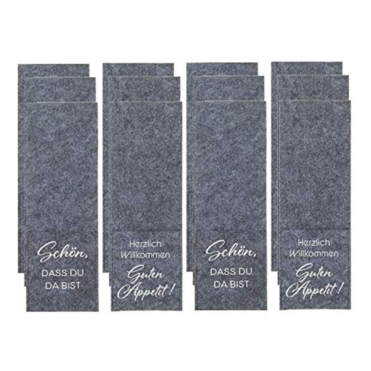 Geschenkestadl BestecktascheEs freut mich, dass du Interesse an den 12 Bestecktaschen aus grauem Filz hast. Diese Taschen sind eine wunderbare Möglichkeit, deinen Tisch sowohl einfach als auch dekorativ zu decken. Mit den zwei verschiedenen Sprüchen „Herzlich Willkommen Guten Appetit“ und „Schön, dass du da bist“ sind sie perfekt für jeden Anlass, sei es ein festliches Dinner oder der tägliche Gebrauch.Es werden von jedem Spruch 6 Stück geliefert. Die Größe von ca. 9 cm in der Länge und 26 cm in der Breite bietet ausreichend Platz für Besteck und sorgt dafür, dass alles ordentlich aussieht. Hergestellt aus 100% Polyester Filz mit einer Dicke von 3 mm, sind sie zudem umweltfreundlich, da sie das Öko Tex Zertifikat tragen. Im Lieferumfang sind 12 Stück enthalten, die in zwei verschiedenen Designs sortiert sind.