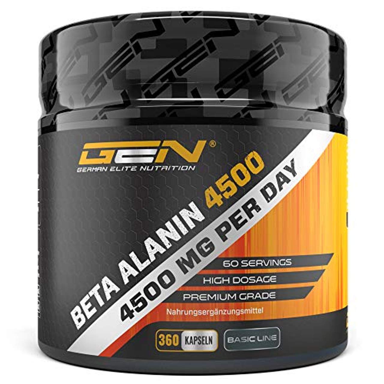 GEN GERMAN ELITE NUTRITION Beta Alanin 4500Beta Alanin im Detail Wer viel Sport macht, kommt an Beta Alanin fast nicht vorbei, auch wenn es bis vor kurzem noch als Exot unter den Supplements gezählt hatte, erfreut es sich mittlerweile immer größerer Beliebtheit.Aber was ist das eigentlich? Beta Alanin ist wie Alanin eine nicht-essentielle Aminosäure, die von unserem Körper selbst hergestellt werden kann. Deshalb könnte man denken, dass eine zusätzliche Gabe von Beta Alanin gar nicht nötig wäre.So einfach ist es aber leider nicht. Vor allem für Sportler ist die zusätzliche Supplementierung von Beta Alanin sinnvoll. Mit Hilfe der Aminosäure L-Histidin wird Beta Alanin im Körper zu Carnosin umgewandelt. Das Carnosin ist wichtig für unseren Säure-Basen-Haushalt.Da L-Histidin im Normalfall mehr zur Verfügung steht als Beta Alanin, entsteht ein Ungleichgewicht, welches sich in schnellerer Muskelermüdung bemerkbar macht. Beta Alanin kann den Carnosinspeicher auf Dauer erhöhen und eine Übersäuerung findet nicht mehr so schnell statt.In Lebensmitteln kommt Beta Alanin vorwiegend in Rindfleisch, Schweinefleisch und Hühnchen vor. Allerdings ist es fast unmöglich hieraus eine für Sportler signifikante Menge von 4-6 g zu erhalten, welche eine Sportler benötigt. Highlights auf einen Blick: HOCHDOSIERTE BETA ALANINE KAPSELN: In jeder Dose befinden sich 360 Beta Alanin Kapseln mit jeweils 750 mg für praktische 60 Tage Anwendung. Jede Tagesportion von 6 Kapseln versorgen Ihren Körper mit 4500 mg reinem Beta-Alanin. PREMIUM AMINOSÄURE: Unsere Beta-Alanin Rohstoff hat eine besonders hohe Reinheit mit +99%. BASIC AMINOSÄURE: Beta Alanin lässt sich hervorragend mit anderen Aminosäuren wie L-Citrullin, L-Glutamin, Taurin, L-Tyrosin, L-Arginin & AAKG kombinieren. OHNE UNERWÜNSCHTE ZUSÄTZE: Die Tabletten sind frei von Magnesiumstearat, Aromen, Farbstoffen, Stabilisatoren & selbstverständlich auch GMO-frei, laktosefrei & glutenfrei. Nice to Know! Beta Alanin sollte immer zu einer Mahlzeit eingenommen werden, da es so besser aufgenommen werden kann und das unangenehme Kribbeln etwas reduziert wird. Beta Alanin sollte kurweise eingenommen werden, mit einer Dosierung von 4000mg - max. 6000 mg, je nach Verträglichkeit und Leistungsstand des Sportlers Bei Beta Alanin ist es wichtig es täglich einzunehmen, egal ob Trainingstag oder Nicht-Trainingstag, da der Carnosinspiegel erst durch eine längere und konstante Einnahme erhöht werden kann.Beta Alanin wird oft von Sportlern genutzt, um ein Plateau zu überwinden Sehr gut kombinierbar mit anderen Aminosäuren und vor allem mit Creatin (egal welche Form) Warum sollte man nicht gleich Carnosin nehmen? Nun sollte man sich die Frage stellen, warum nimmt man nicht gleich Carnosin anstelle von Beta Alanin ein und erspart sich den ganzen Umwandlungsprozess?Die Antwort darauf ist eigentlich ganz einfach, zum einen ist die Supplementierung von Beta Alanin im Preis / Leistungsverhältnis einfach nicht zu schlagen. Zum anderen kann Beta Alanin viel besser den Magen-Darmtrakt und das Verdauungssystem durchqueren, als es Carnosin je könnte!