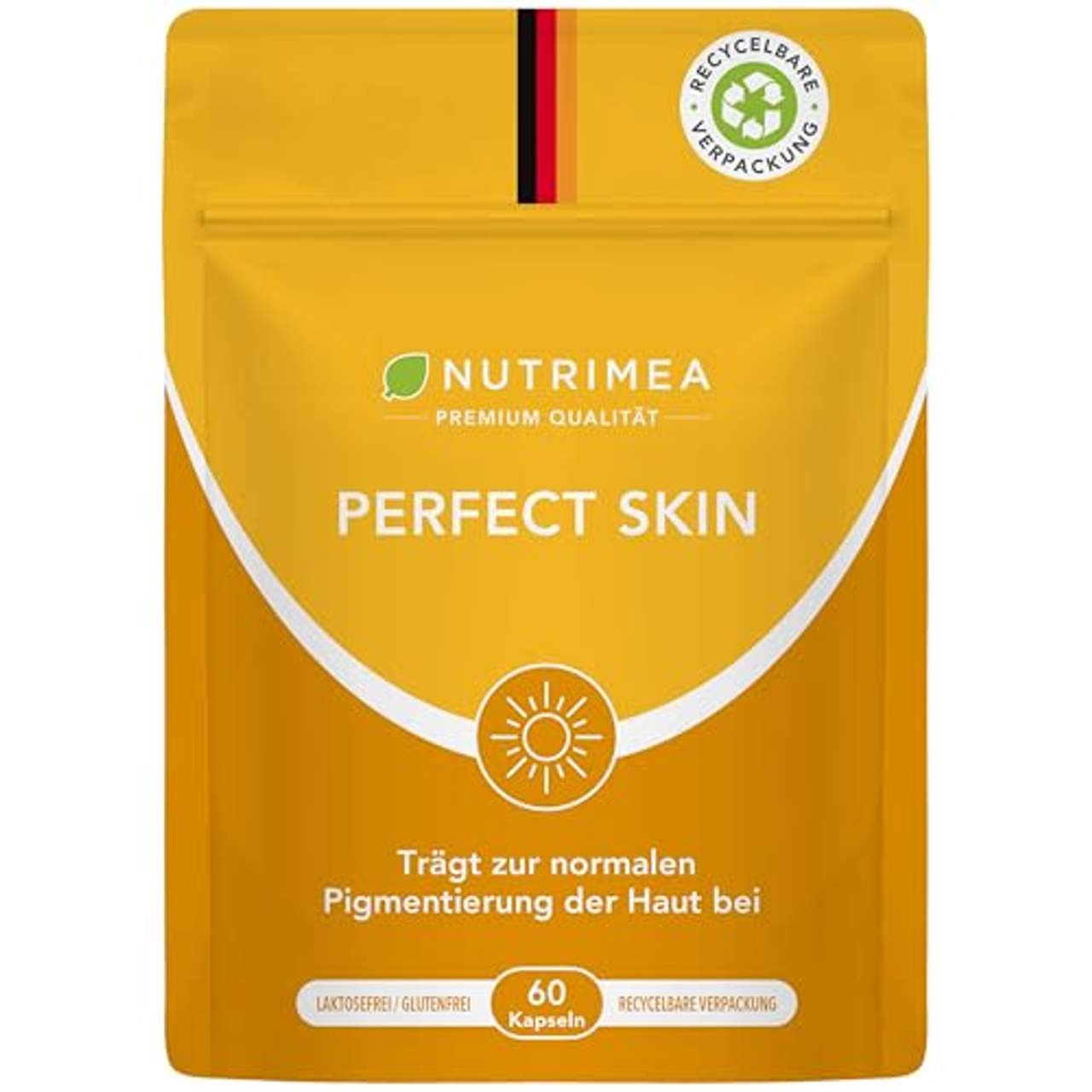 Beta Carotin SUN Plus BräunungskapselnBRÄUNE & SCHUTZ: Eine natürlich schöne Bräune, wer träumt nicht davon? Die Sonnenvitamine (Beta Carotin, Vitamin A, Kupfer) in unseren Bräunungskapseln bereiten Ihre Haut optimal auf die Sonne vor und erhalten Ihre Bräune noch wochenlang nach dem Urlaub. Als Tan Optimizer beschleunigt Perfect Skin den natürlichen Bräunungsprozess der Haut und sorgt für gleichmäßige Bräune ganz ohne Selbstbräuner oder Solarium!Noch dazu schützt der Bräunungsbeschleuniger vor schädlichen UV-Strahlen Sonnenbrand. BETA CAROTIN VEGAN: Dank der Kombination natürlicher Wirkstoffe sorgen die Bräunungstabletten Perfect Skin dafür, dass selbst helle Haut bereit für sonnigen Tage ist! Algen-abgeleitetes ß-Carotin, Tomatenlykopen und Carotinoide verleihen der Haut auf natürliche Weise einen gebräunten Teint.Gleichzeitig schützt Vitamin E und Kupfer die Haut vor schädlichen Auswirkungen der Sonne und vor allem vorzeitigem Altern. Eine hocheffektive Wirkstoff-Kombination in einer einzigen Bräunungskapseln! NUR 1 KAPSEL/TAG: 1 Kapsel pro Tag reicht aus, um Ihre Haut auf die Sonne vorzubereiten. Für eine optimale Wirksamkeit sollte die Behandlung 1 bis 2 Monate vor dem direkten Aussetzen der Sonneneinstrahlung beginnen. Nach der Rückkehr aus dem Urlaub können Sie die Bräunungskapseln noch einige Wochen lang einnehmen, um Ihre Bräune zu erhalten. 100% NATÜRLICH + VEGAN: Alle Inhaltsstoffe von Perfect Skin wurden sorgfältig ausgewählt. Gentechnikfrei, glutenfrei und stearatfrei, Perfect Skin ist sowohl für Vegetarier als auch für Veganer geeignet. Alle natürlichen Ergänzungen von Nutrimea stehen für höchste Qualität.