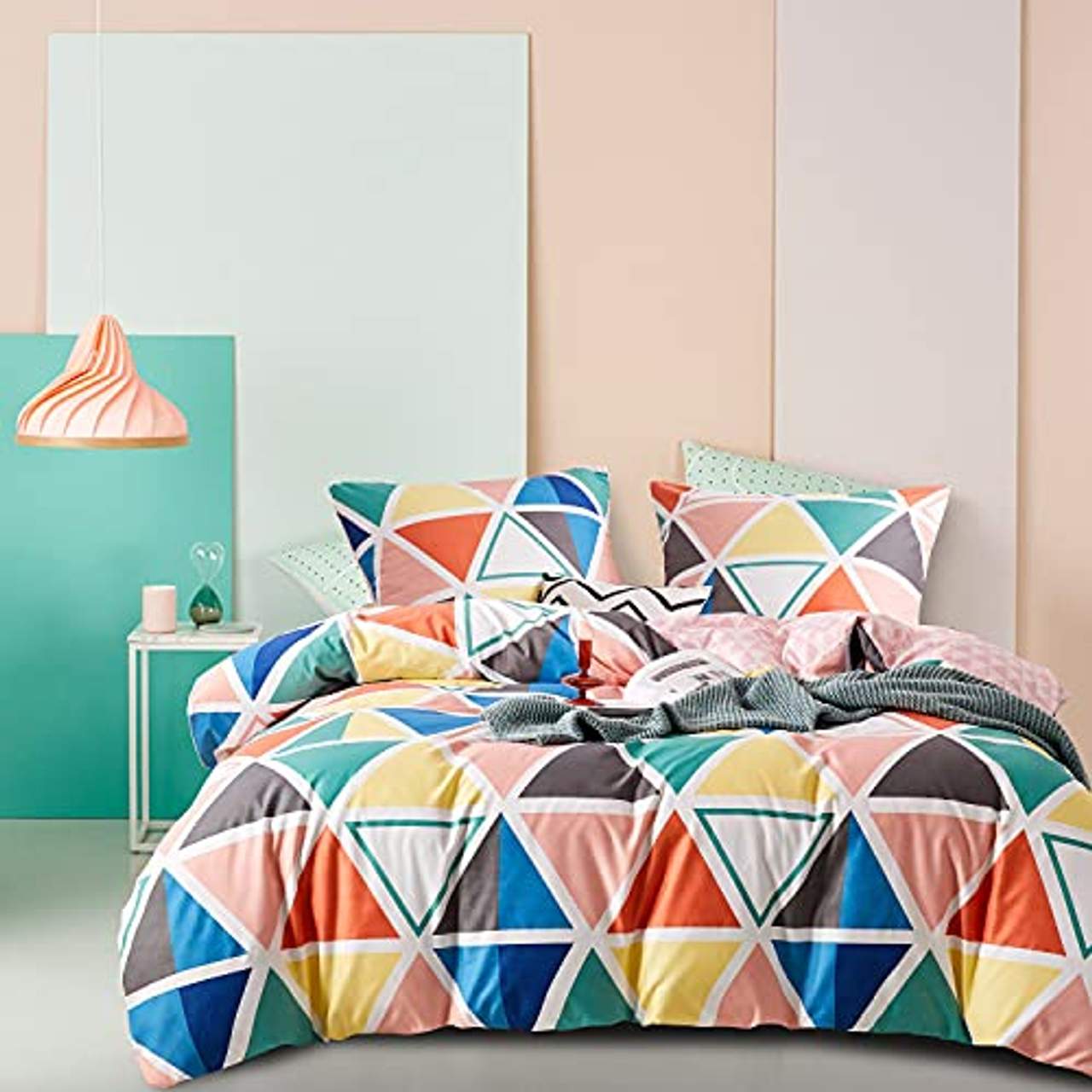 Welche Farben sind in dem geometrischen Muster dieser Bettwäsche enthalten?